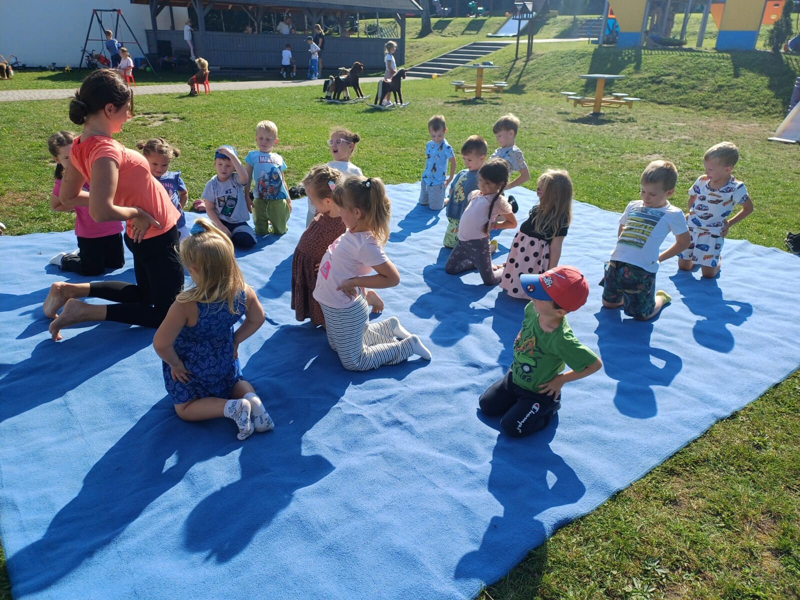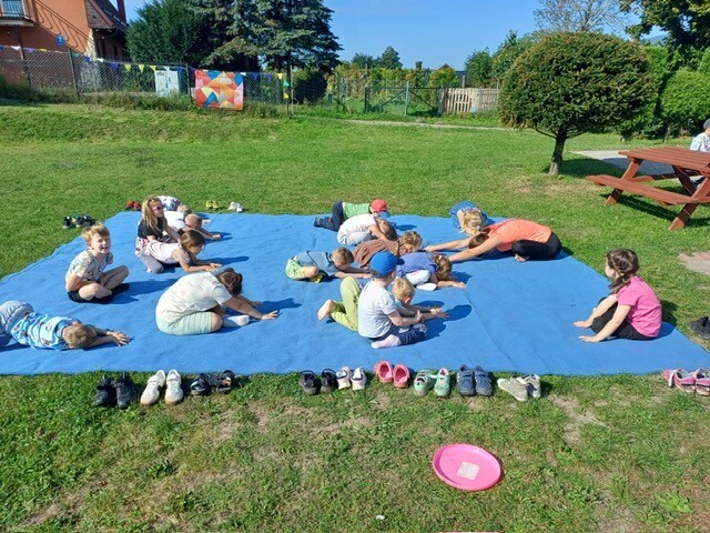 Dzieci z grupy średniaków i starszaków uczestniczyły w ćwiczeniach jogi dostosowanych do ich wieku. Spotkanie rozpoczęło się krótką rozgrzewką, a następnie dzieci wykonywały proste pozycje inspirowane światem zwierząt i przyrody (m.in. „pies", „kot", „drzewo", „motyl").
