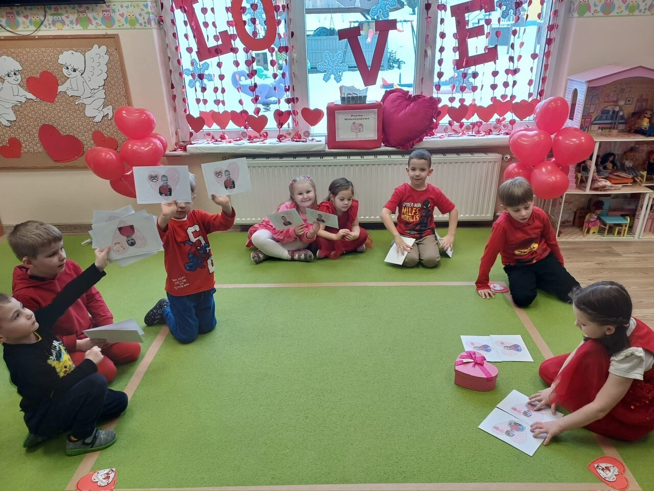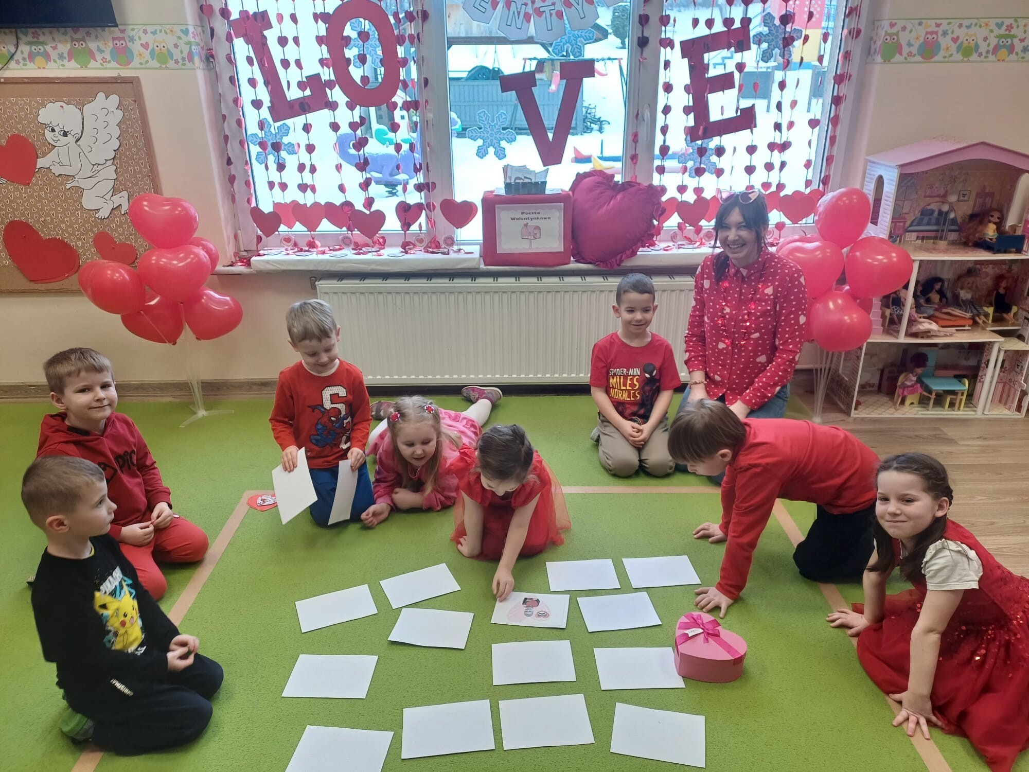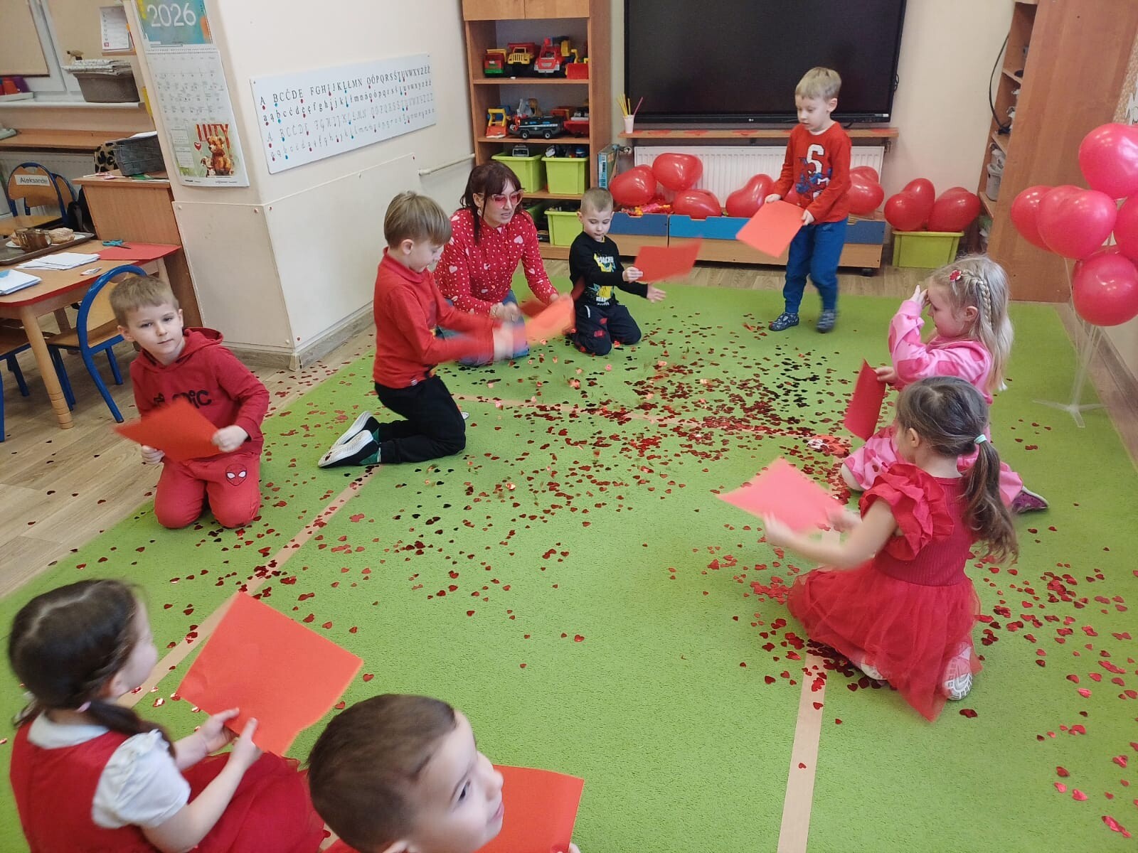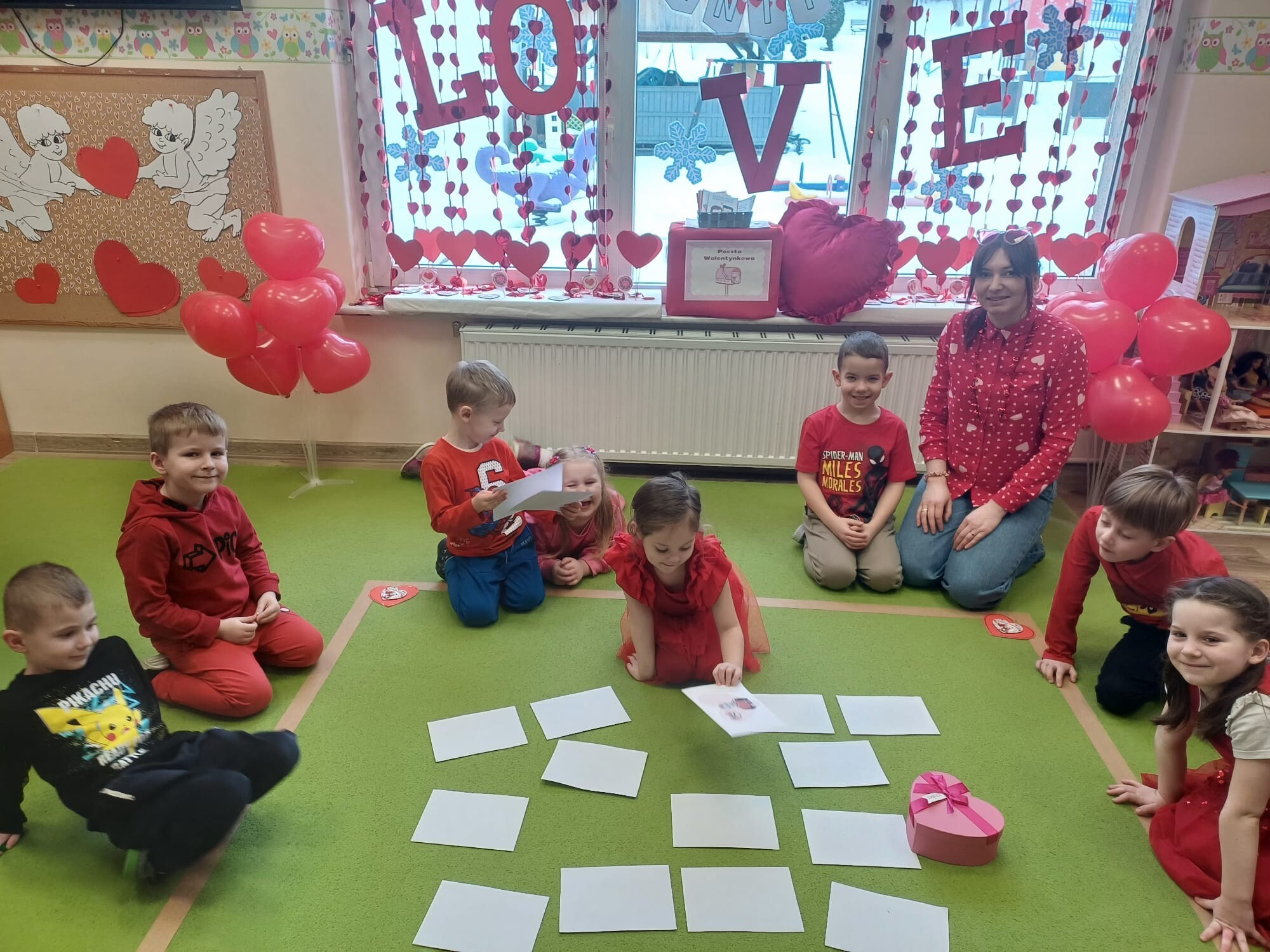 Dzisiaj obchodziliśmy Walentynki, co było dla dzieci świetną okazją do nauki i zabawy. Dzieci rozwiązywały zagadki matematyczne, co rozwijało ich logiczne myślenie. W trakcie zajęć plastycznych tworzyli swoje własne walentynki, a podczas lekcji muzycznych graliśmy na instrumentach, tańczyliśmy w parach, rozmawialiśmy także o emocjach i przyjaźni. Na koniec dnia dzieci mogły cieszyć się słodkim poczęstunkiem oraz bawić się w pocztę walentynkową, co dodało jeszcze więcej radości do tego wyjątkowego dnia.