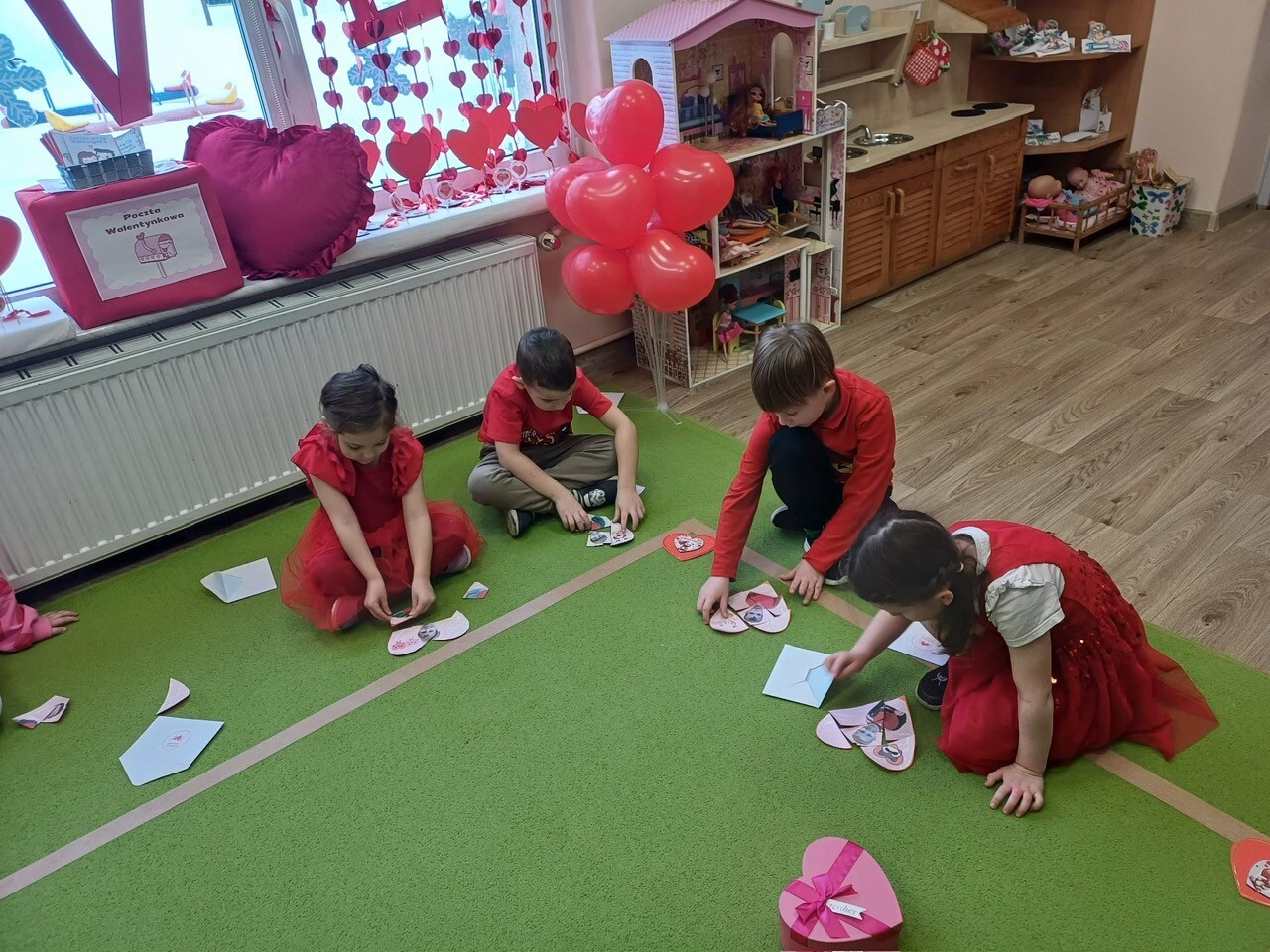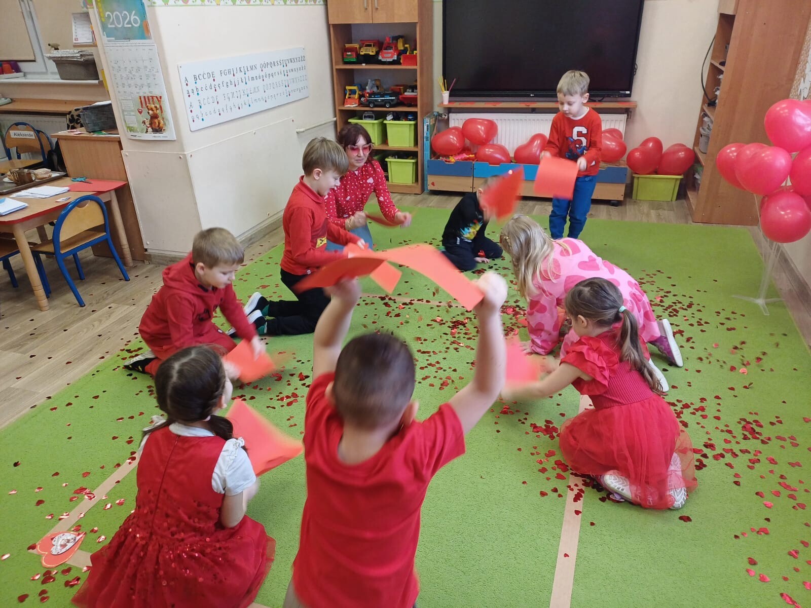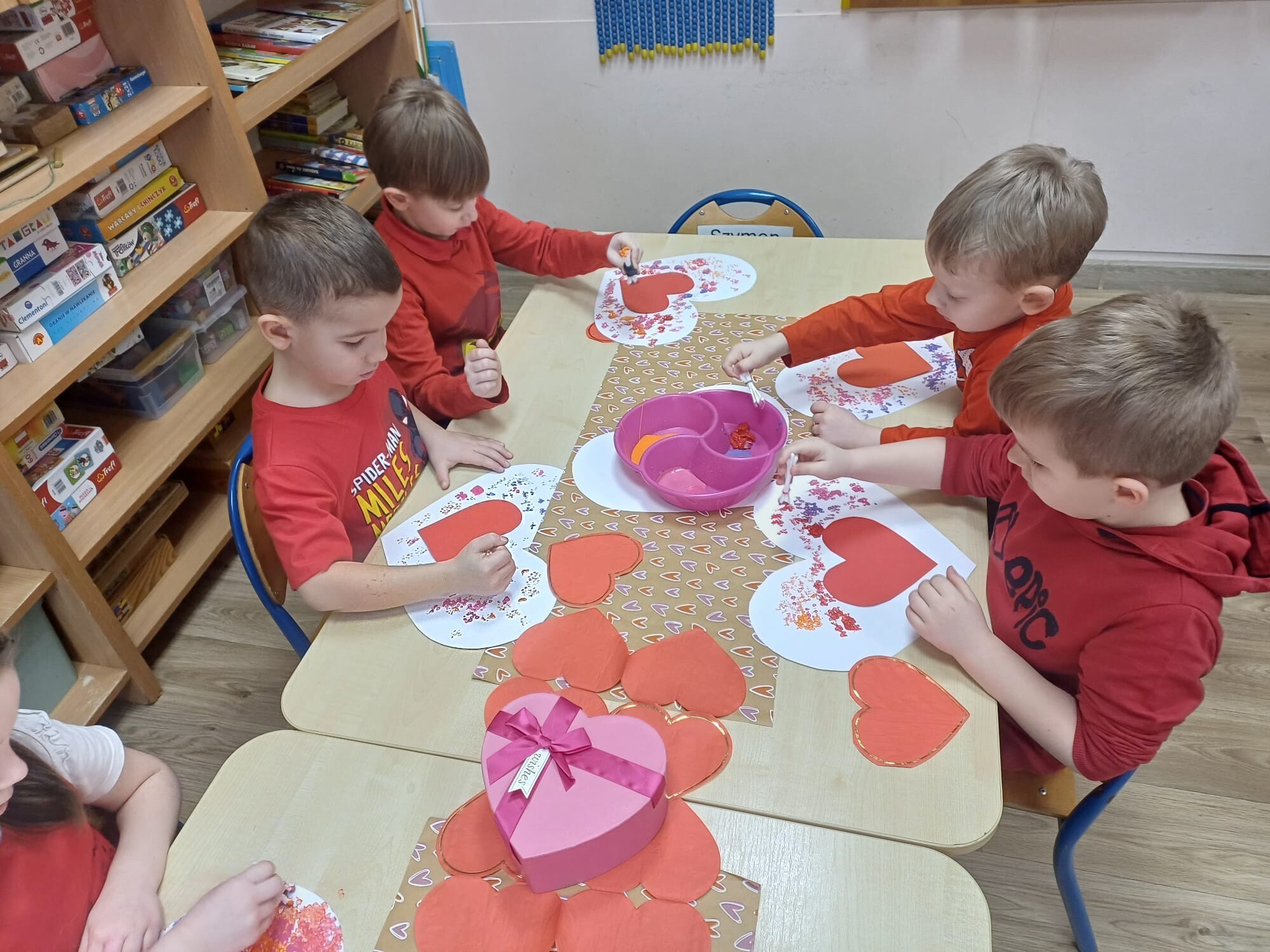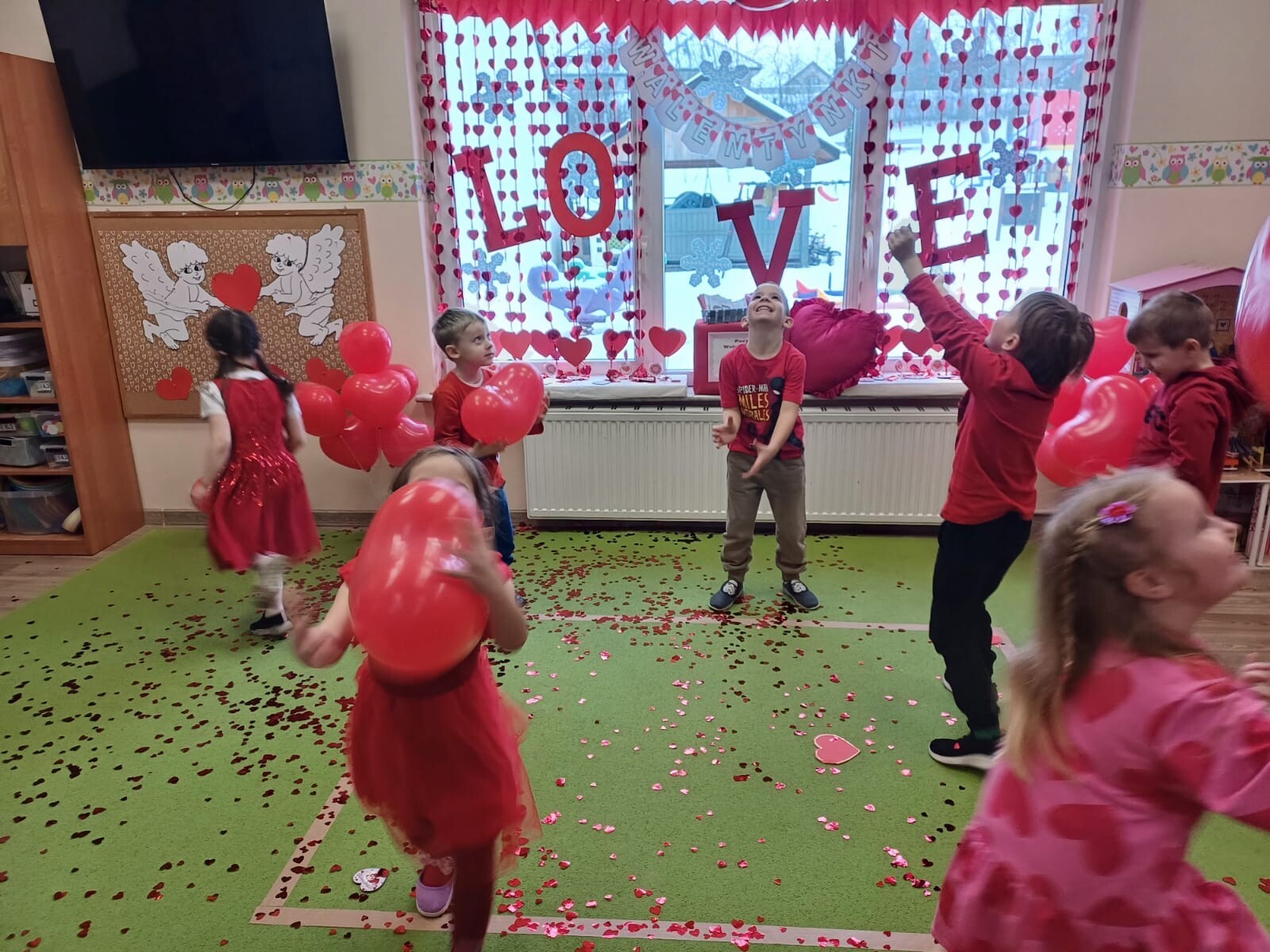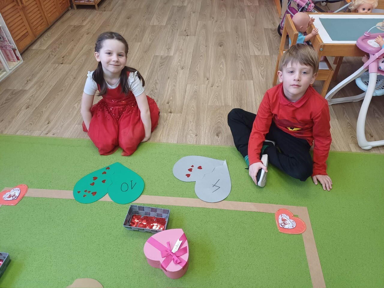 Dzisiaj obchodziliśmy Walentynki, co było dla dzieci świetną okazją do nauki i zabawy. Dzieci rozwiązywały zagadki matematyczne, co rozwijało ich logiczne myślenie. W trakcie zajęć plastycznych tworzyli swoje własne walentynki, a podczas lekcji muzycznych graliśmy na instrumentach, tańczyliśmy w parach, rozmawialiśmy także o emocjach i przyjaźni. Na koniec dnia dzieci mogły cieszyć się słodkim poczęstunkiem oraz bawić się w pocztę walentynkową, co dodało jeszcze więcej radości do tego wyjątkowego dnia.