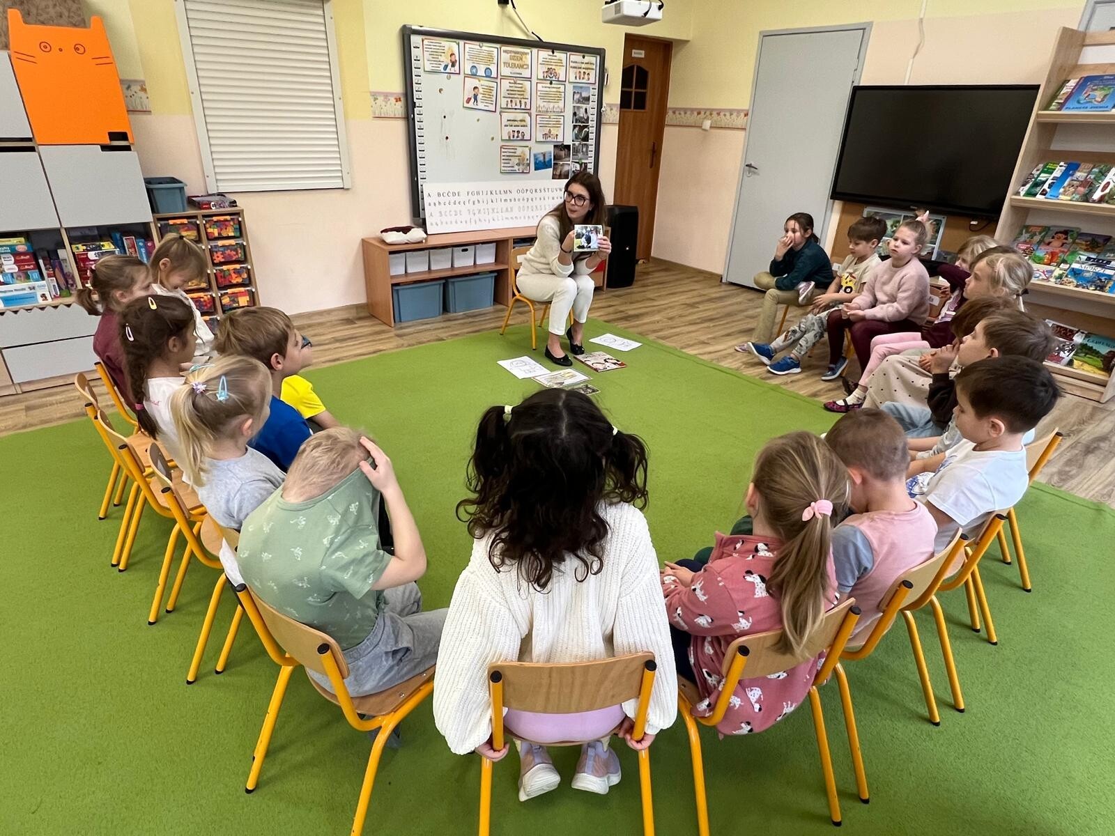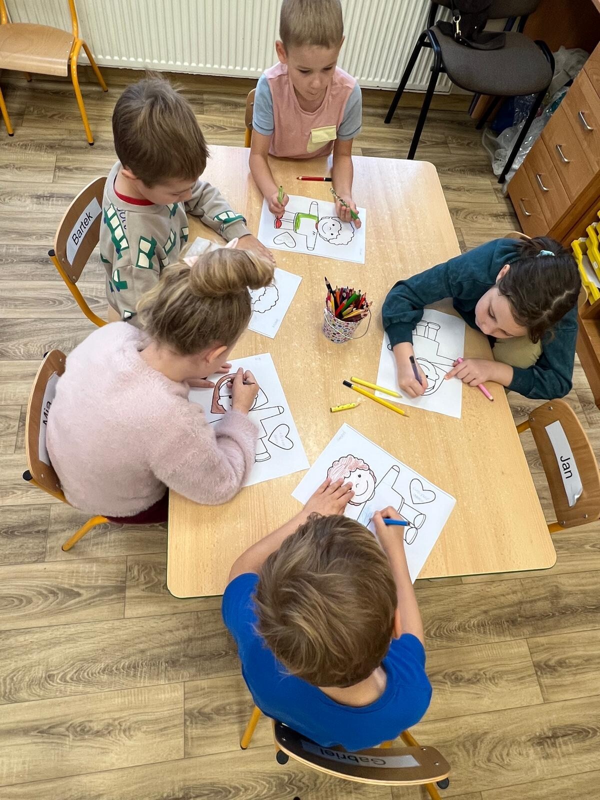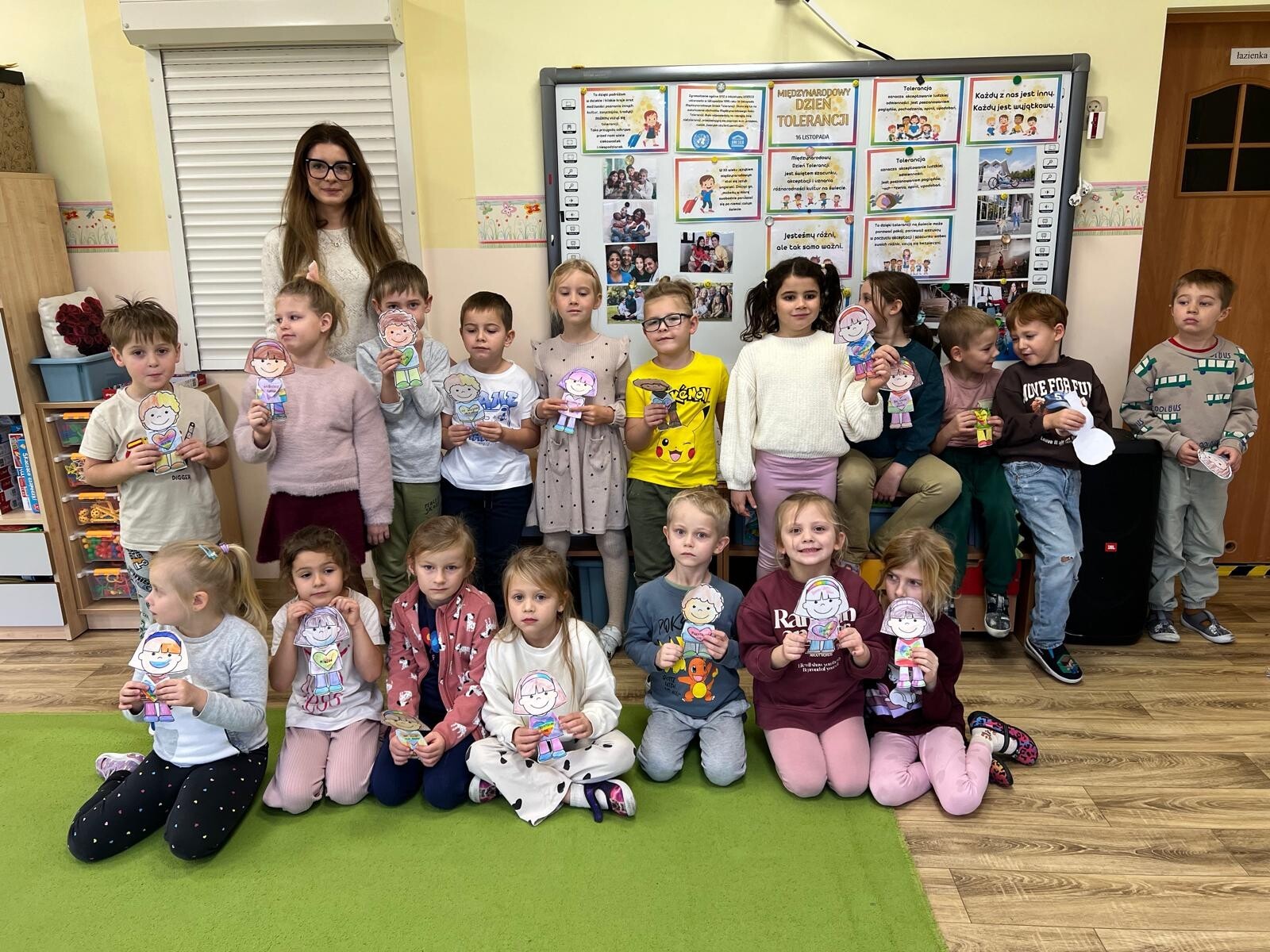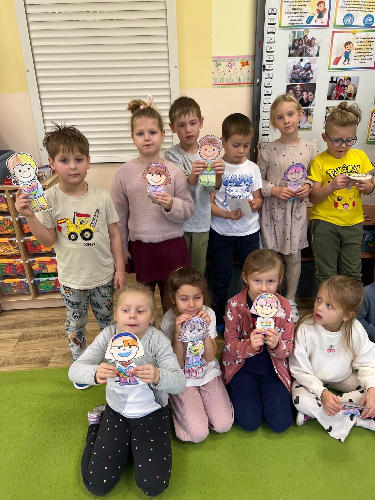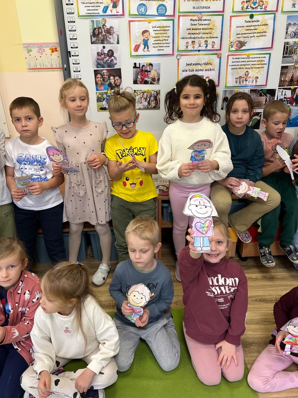 W ramach obchodów Międzynarodowego Dnia Tolerancji dzieci z grupy III poznały znaczenie pojęcia „tolerancja” oraz czynniki, które sprzyjają jej budowaniu. Rozmawiały również o wartościach takich jak empatia, życzliwość i szacunek, które pomagają tworzyć dobre relacje z innymi. Wysłuchały uważnie bajki „Nowa w klasie”, a następnie wspólnie omówiły jej treść i oceniły zachowania bohaterów. Podczas burzy mózgów szukały wyrazów bliskoznacznych i skojarzeń związanych z tolerancją, zastanawiając się, co dla nich oznacza bycie tolerancyjnym. Na zakończenie wykonały pracę plastyczną, tworząc postać ilustrującą wybrane przez siebie skojarzenie z tolerancją oraz wartościami ważnymi w relacjach z innymi.