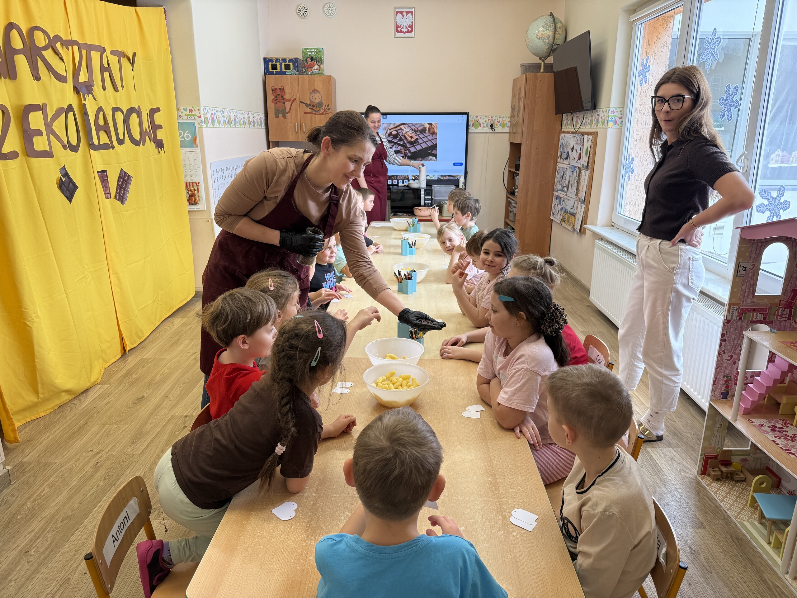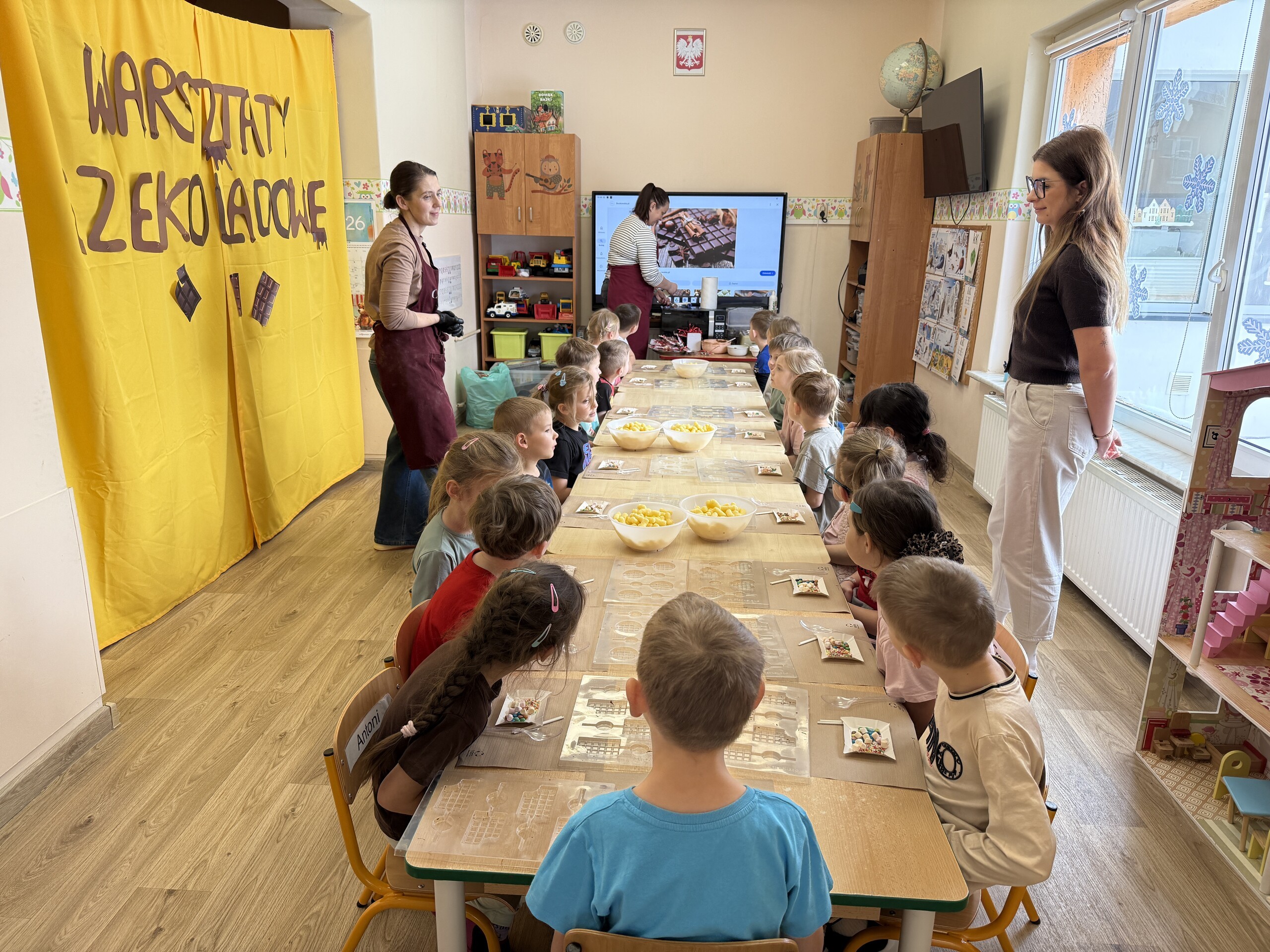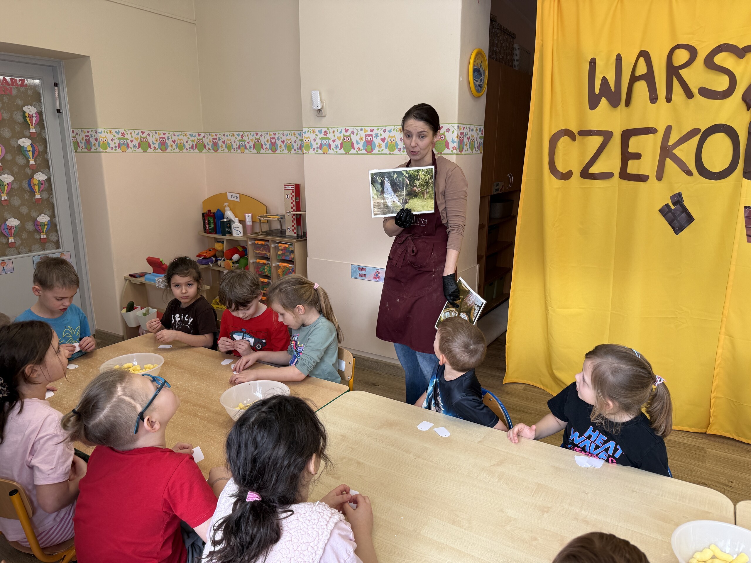 Dziś w naszym przedszkolu było wyjątkowo słodko! Podczas warsztatów czekoladowych dzieci poznały tajniki powstawania czekolady – dowiedziały się, skąd bierze się kakao i jakie etapy przechodzi, zanim trafi do naszych rąk w postaci pysznego przysmaku.