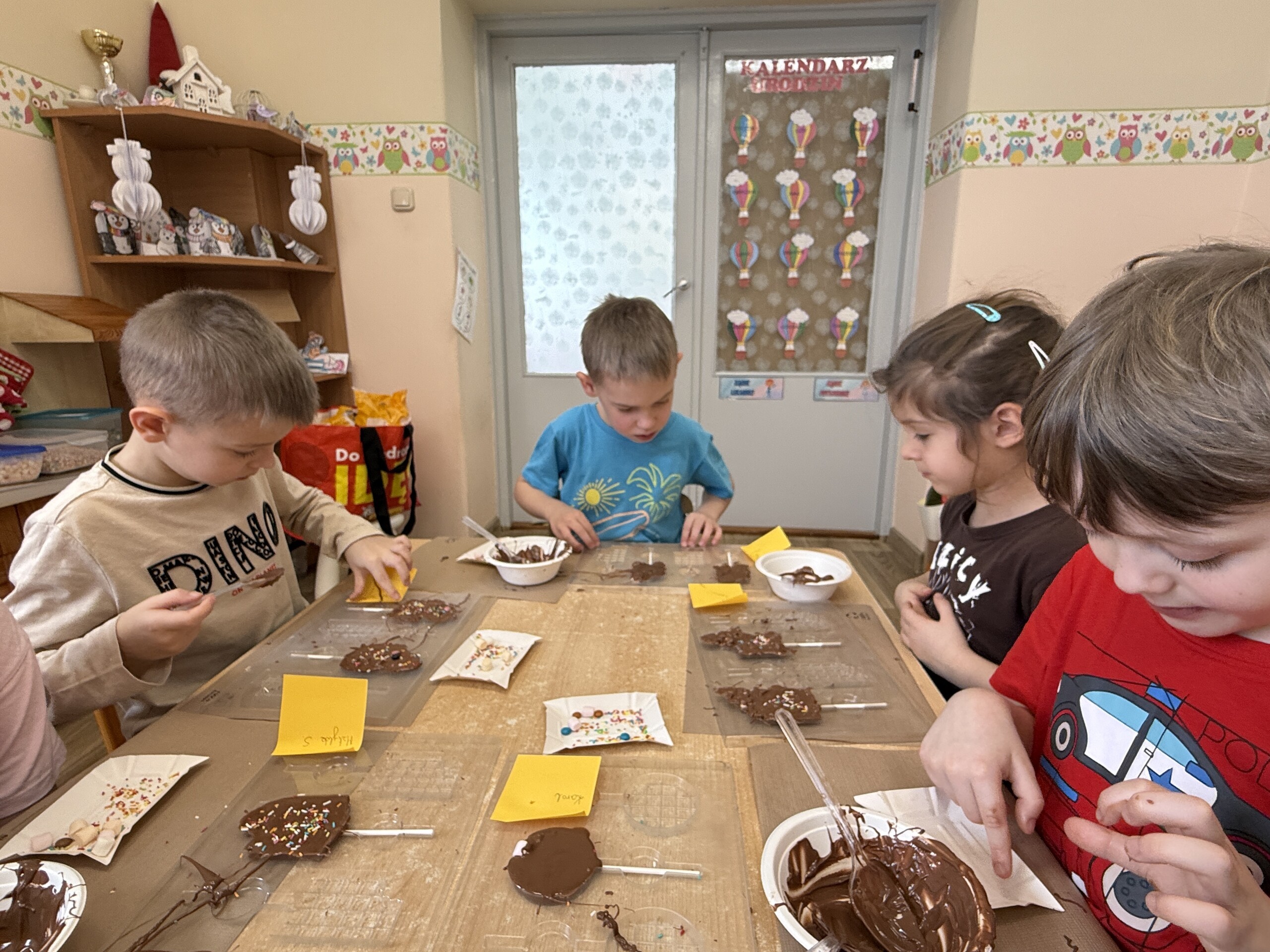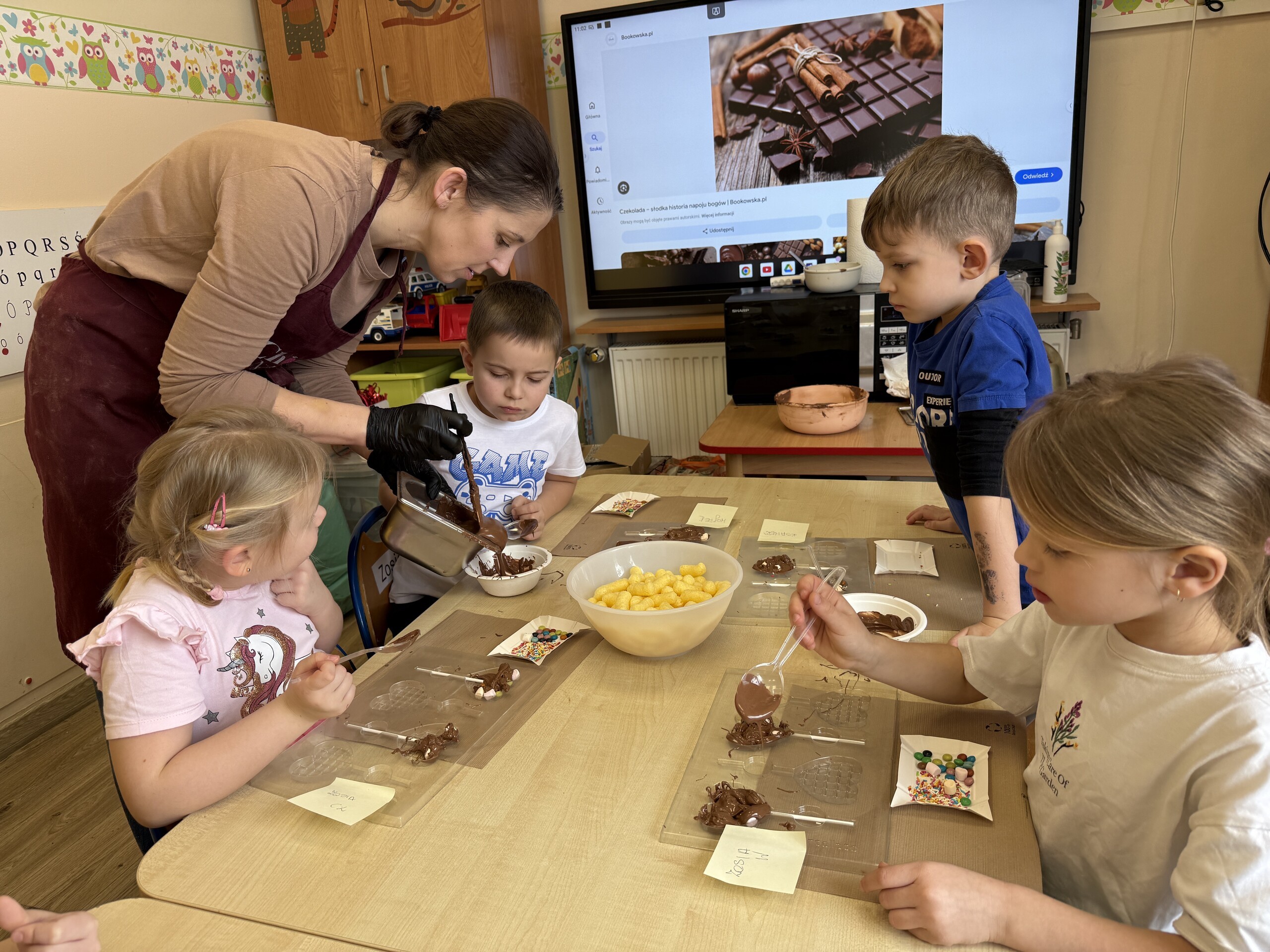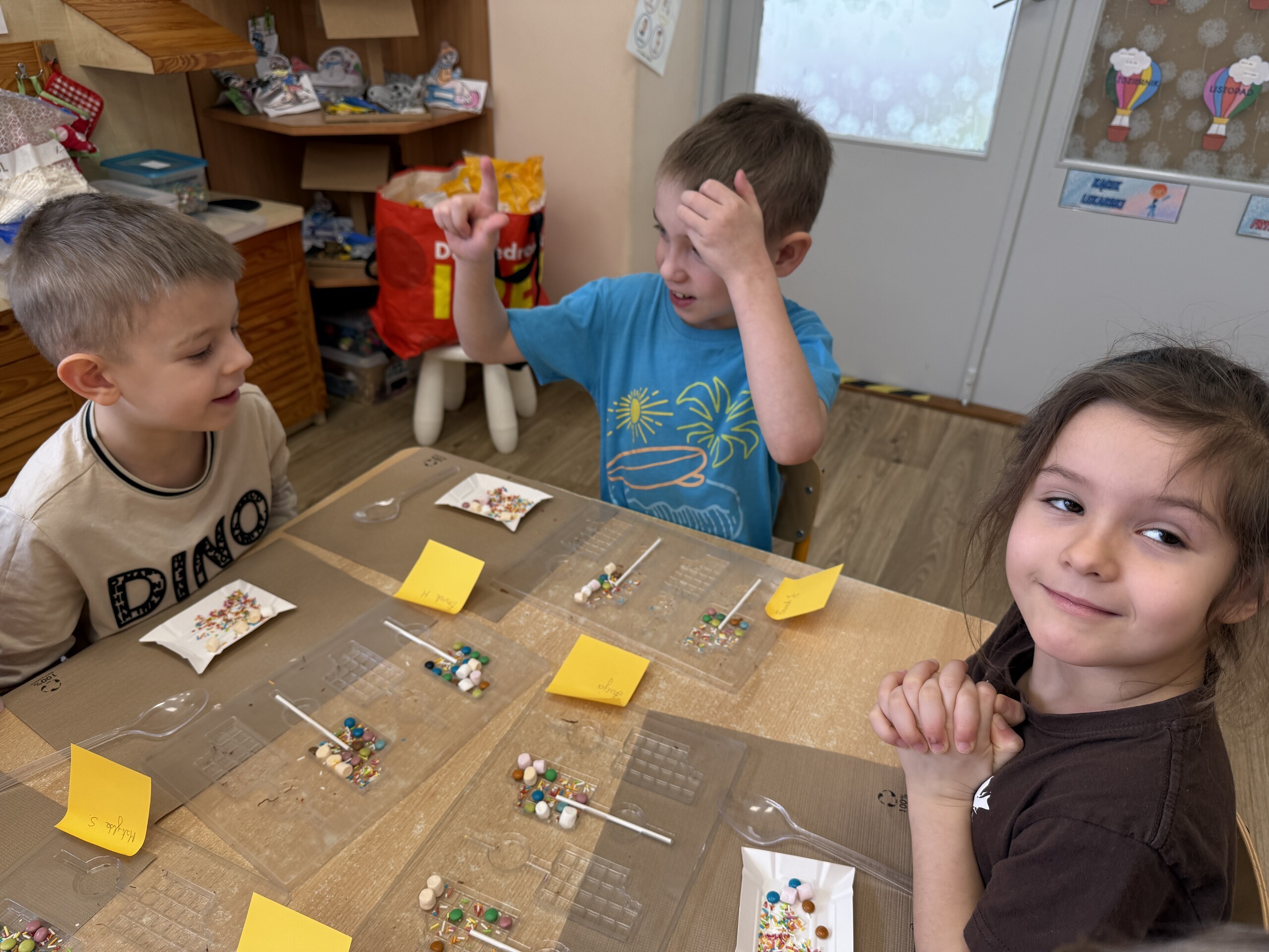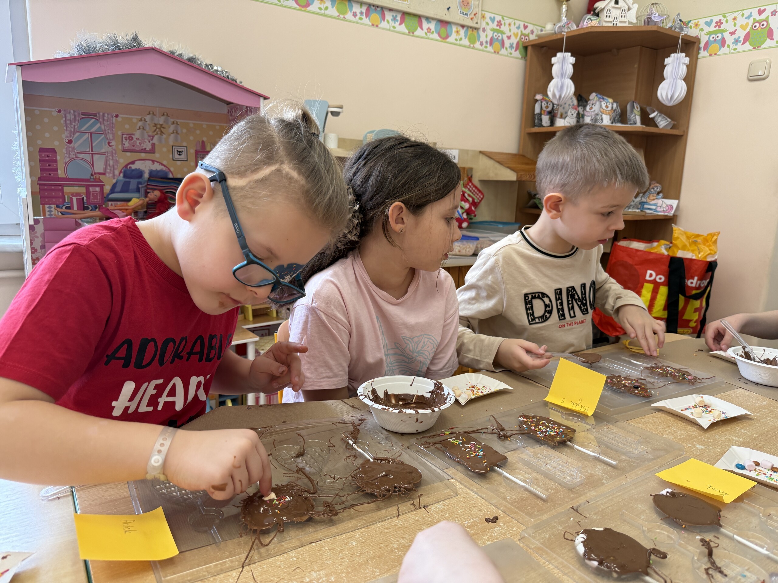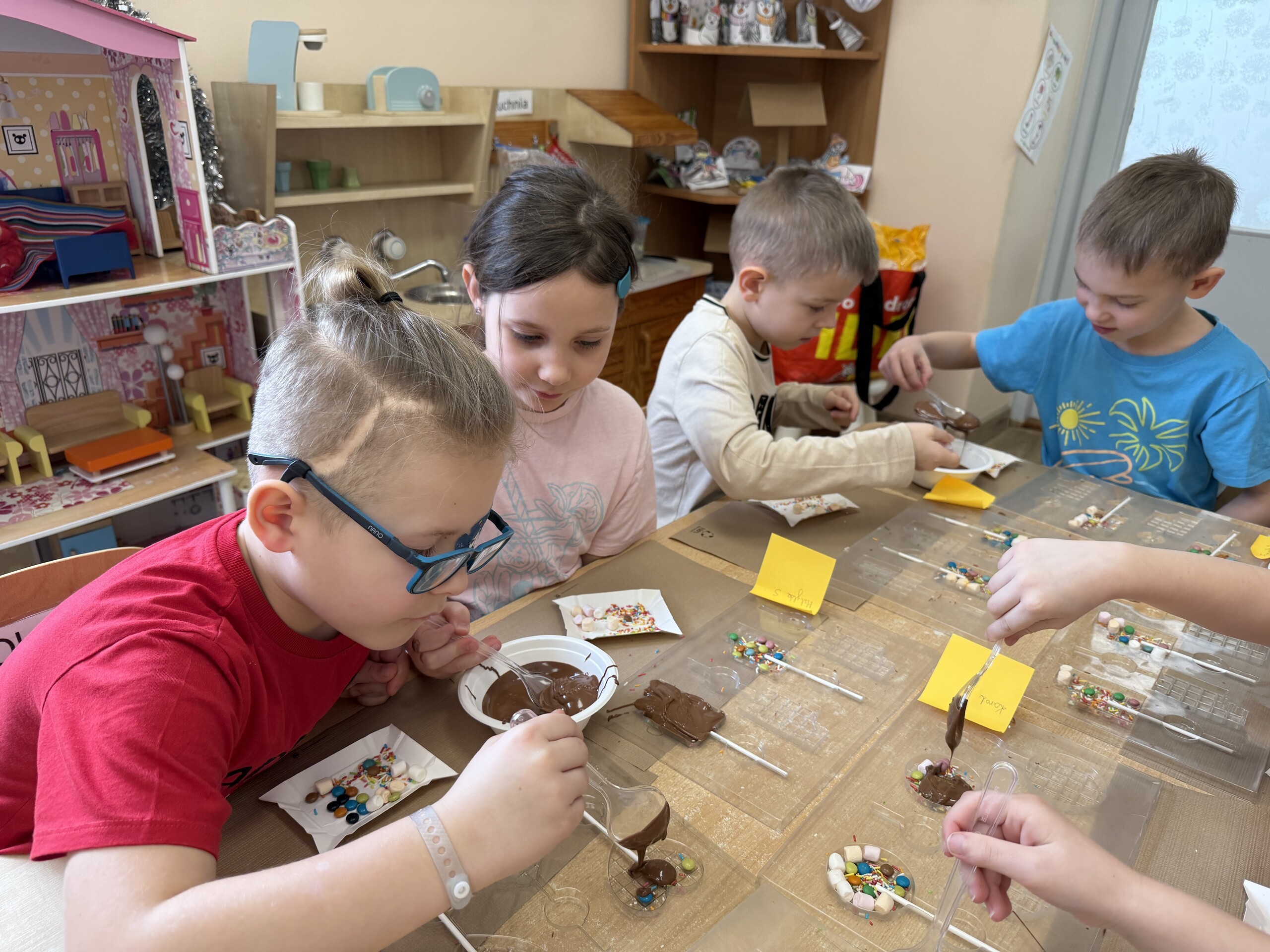 Przedszkolaki własnoręcznie wykonały czekoladowe lizaki, ozdabiały je kolorowymi dodatkami oraz przygotowały piękne, kreatywne etykietki. Każdy mógł poczuć się jak prawdziwy mistrz cukiernictwa!