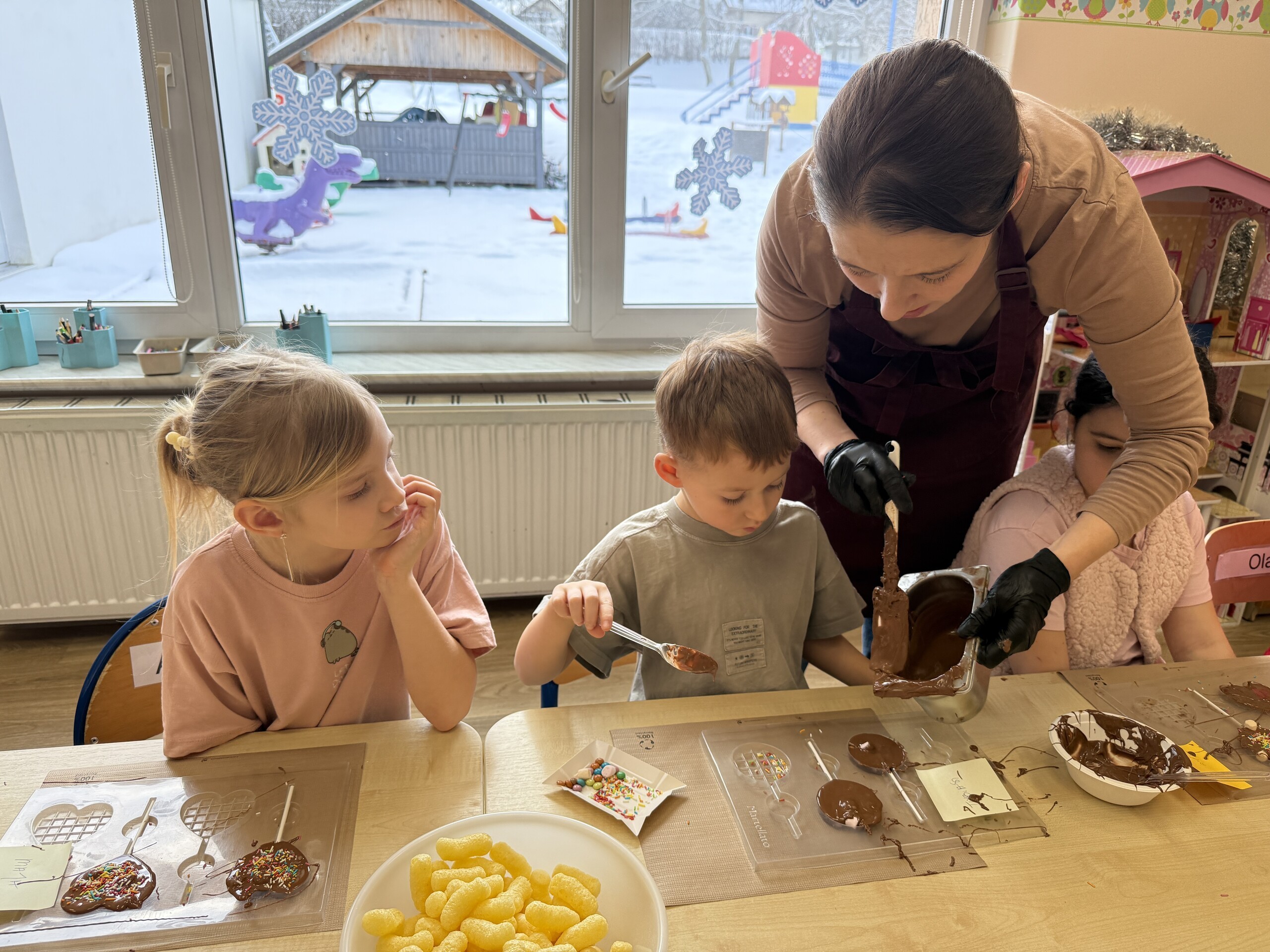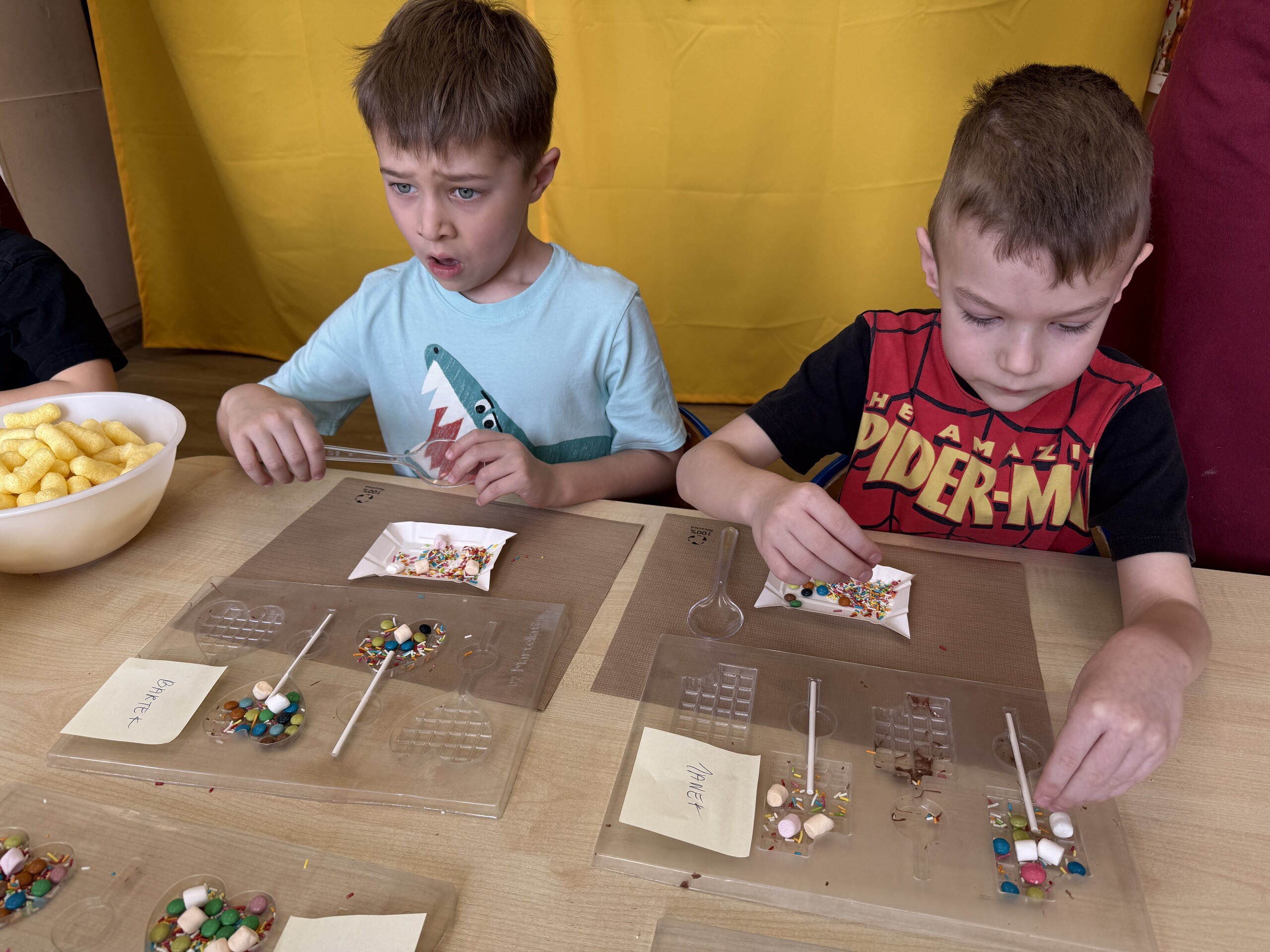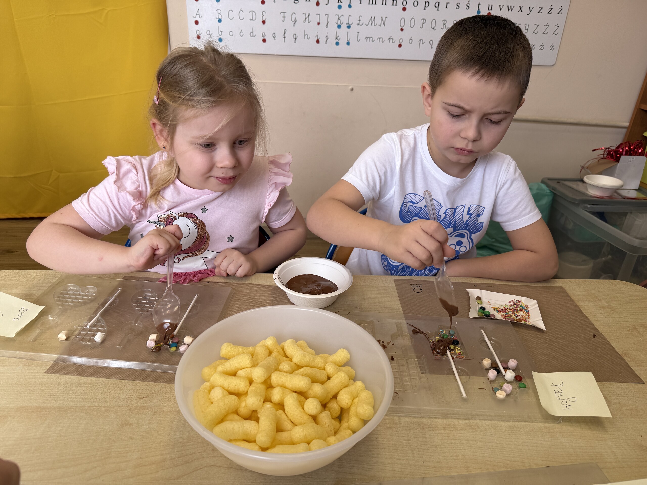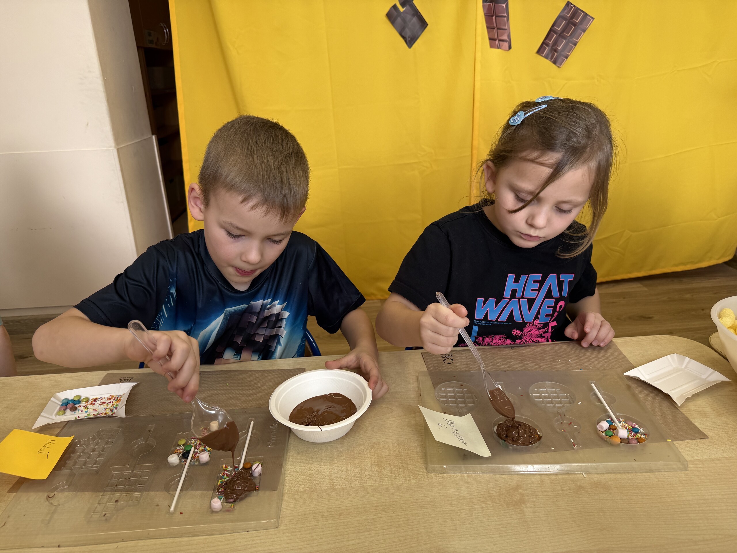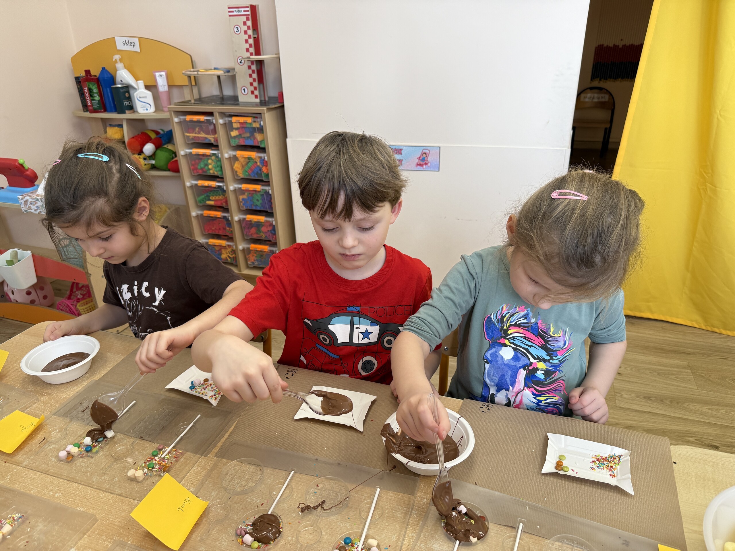 Przedszkolaki własnoręcznie wykonały czekoladowe lizaki, ozdabiały je kolorowymi dodatkami oraz przygotowały piękne, kreatywne etykietki. Każdy mógł poczuć się jak prawdziwy mistrz cukiernictwa!