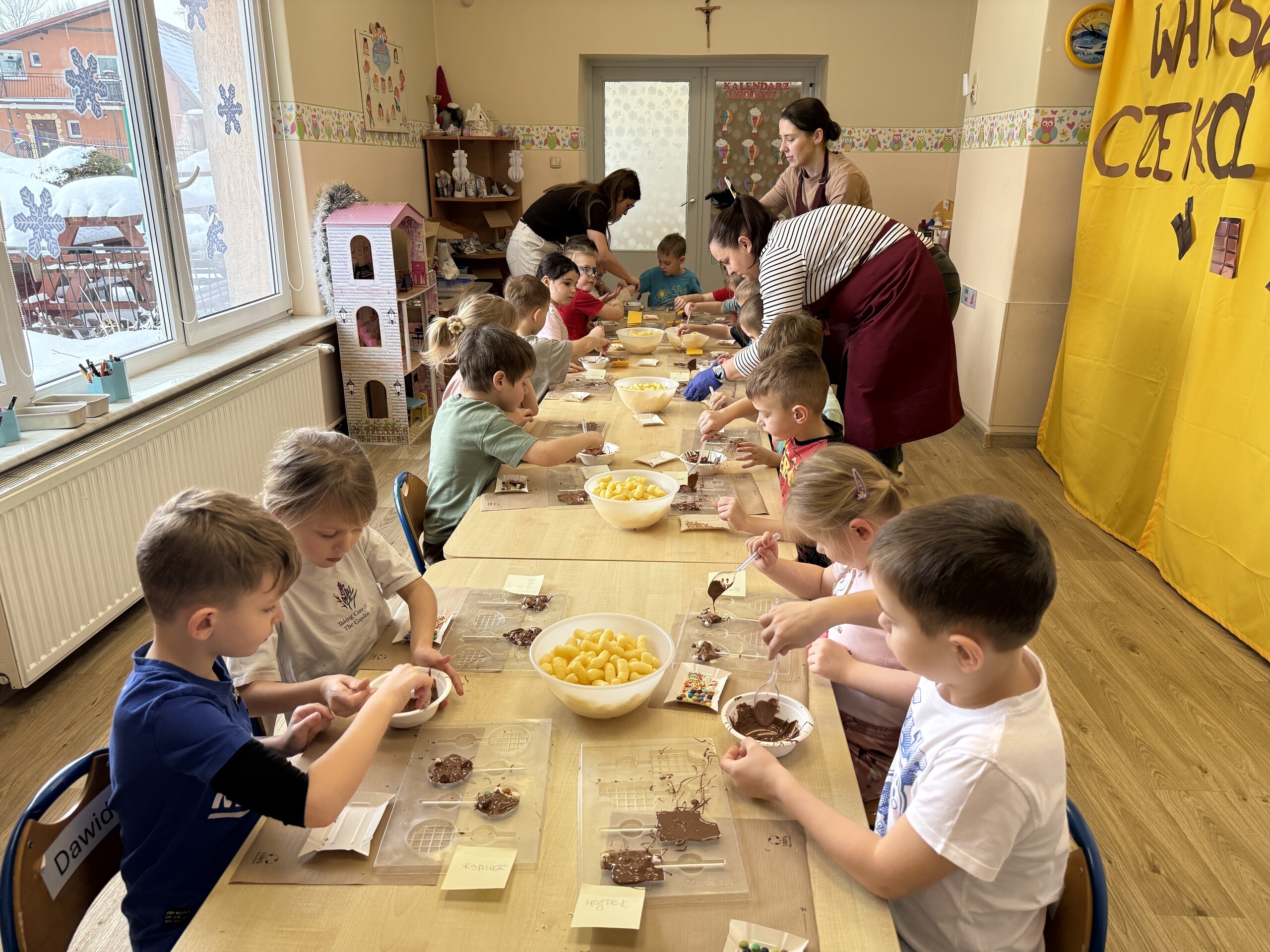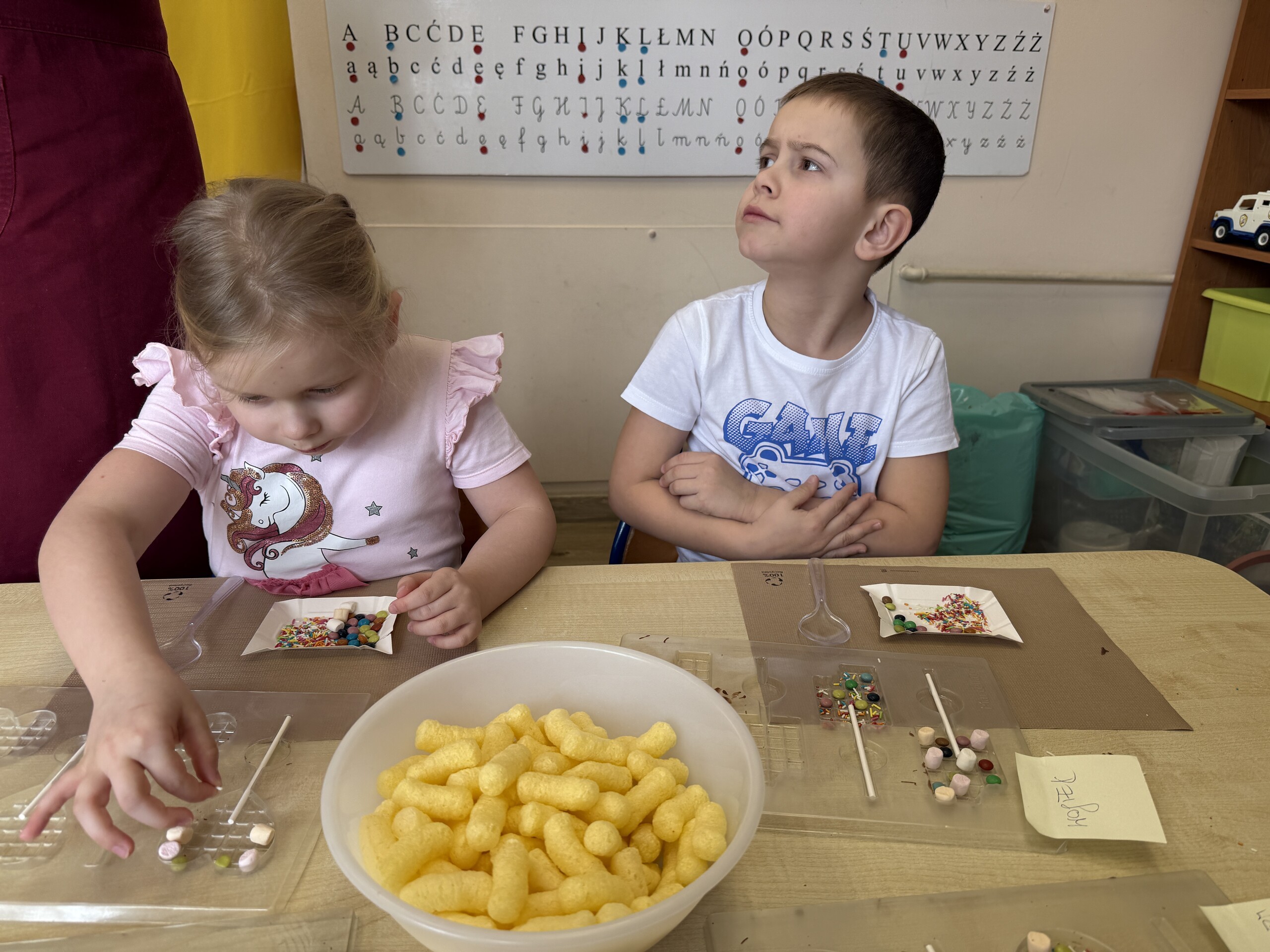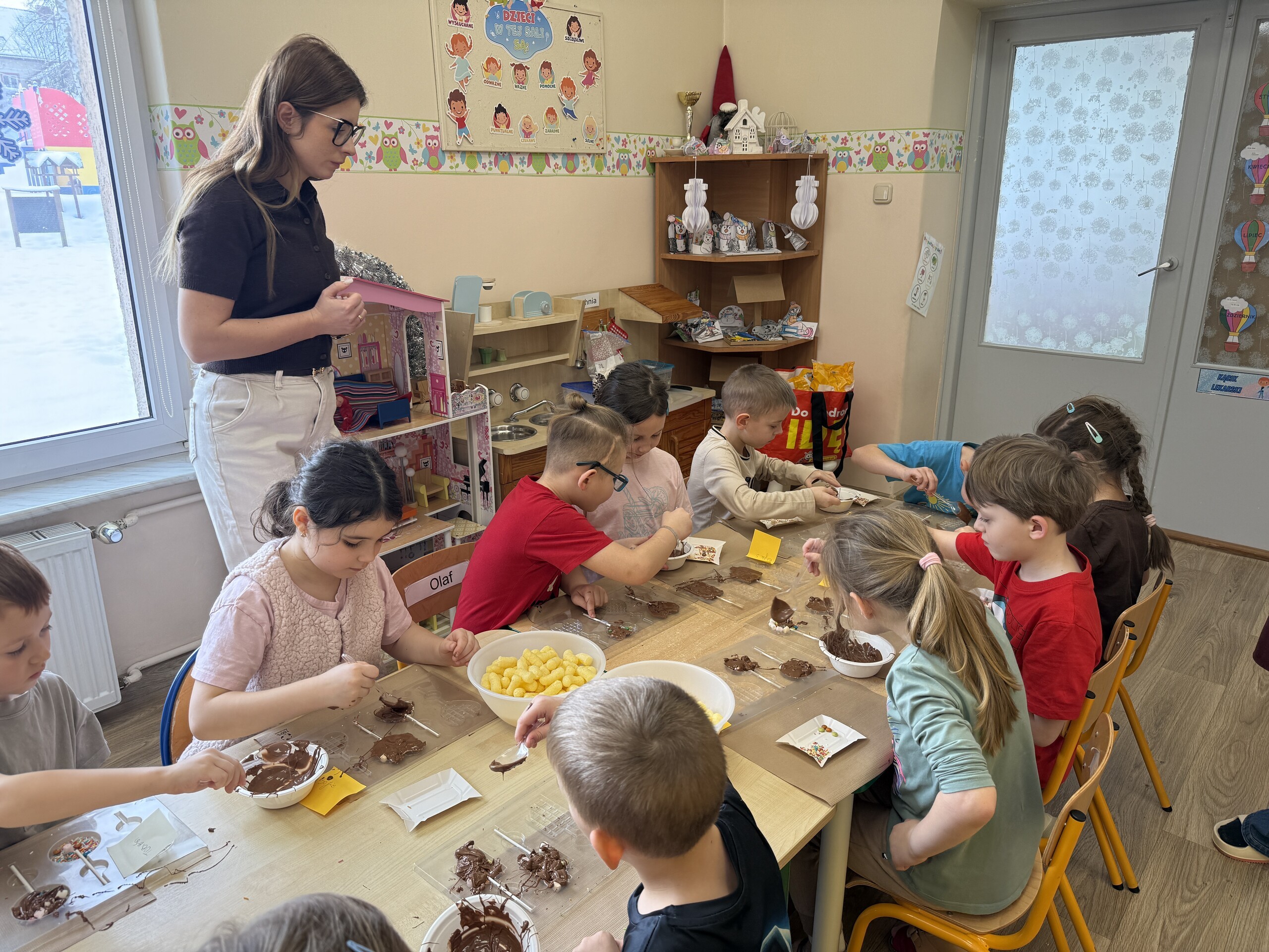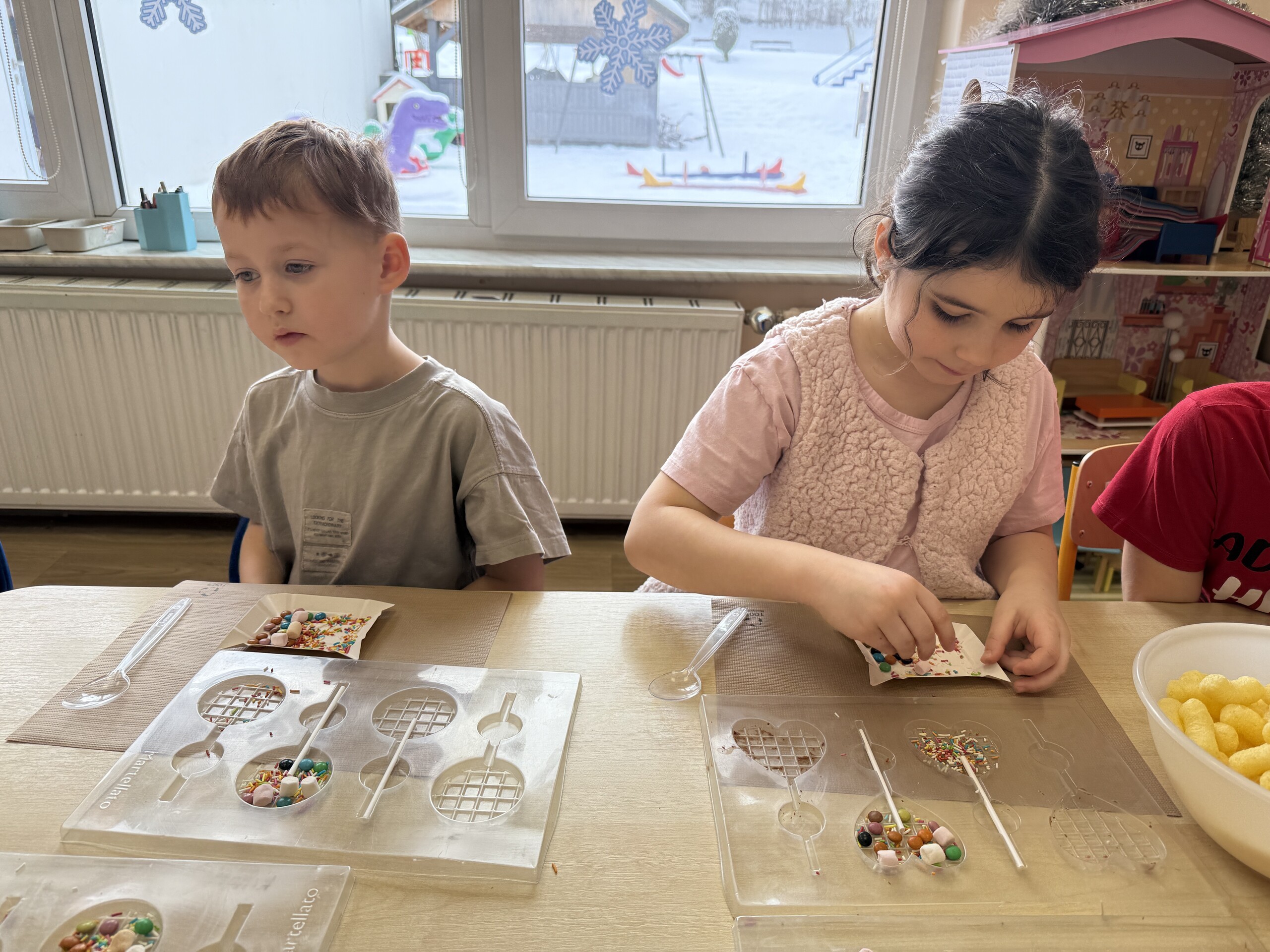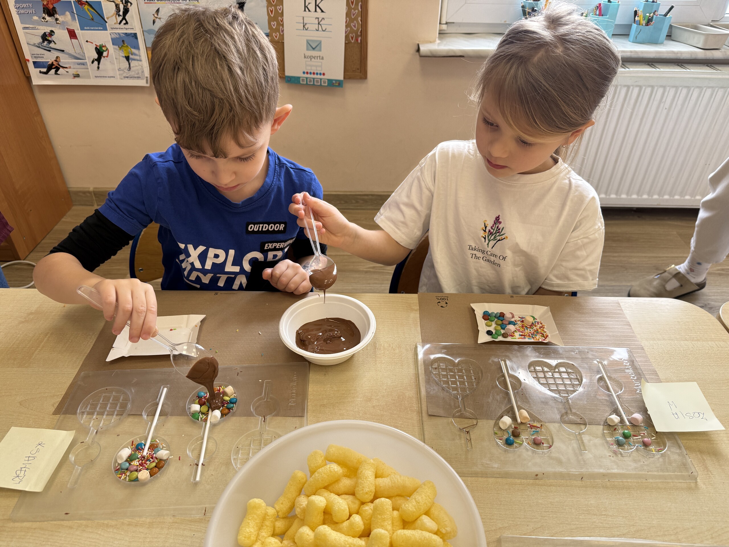 Przedszkolaki własnoręcznie wykonały czekoladowe lizaki, ozdabiały je kolorowymi dodatkami oraz przygotowały piękne, kreatywne etykietki. Każdy mógł poczuć się jak prawdziwy mistrz cukiernictwa!
