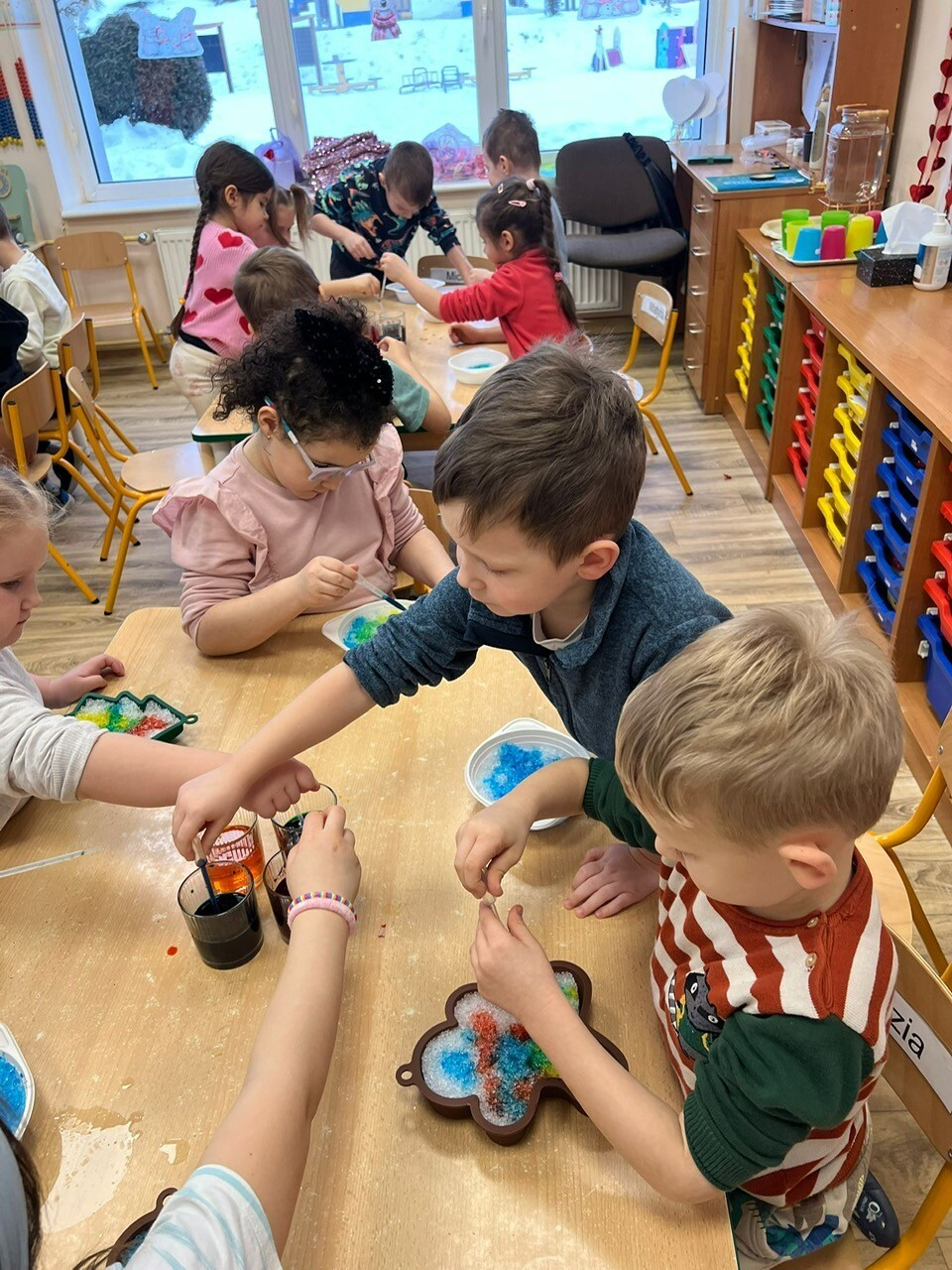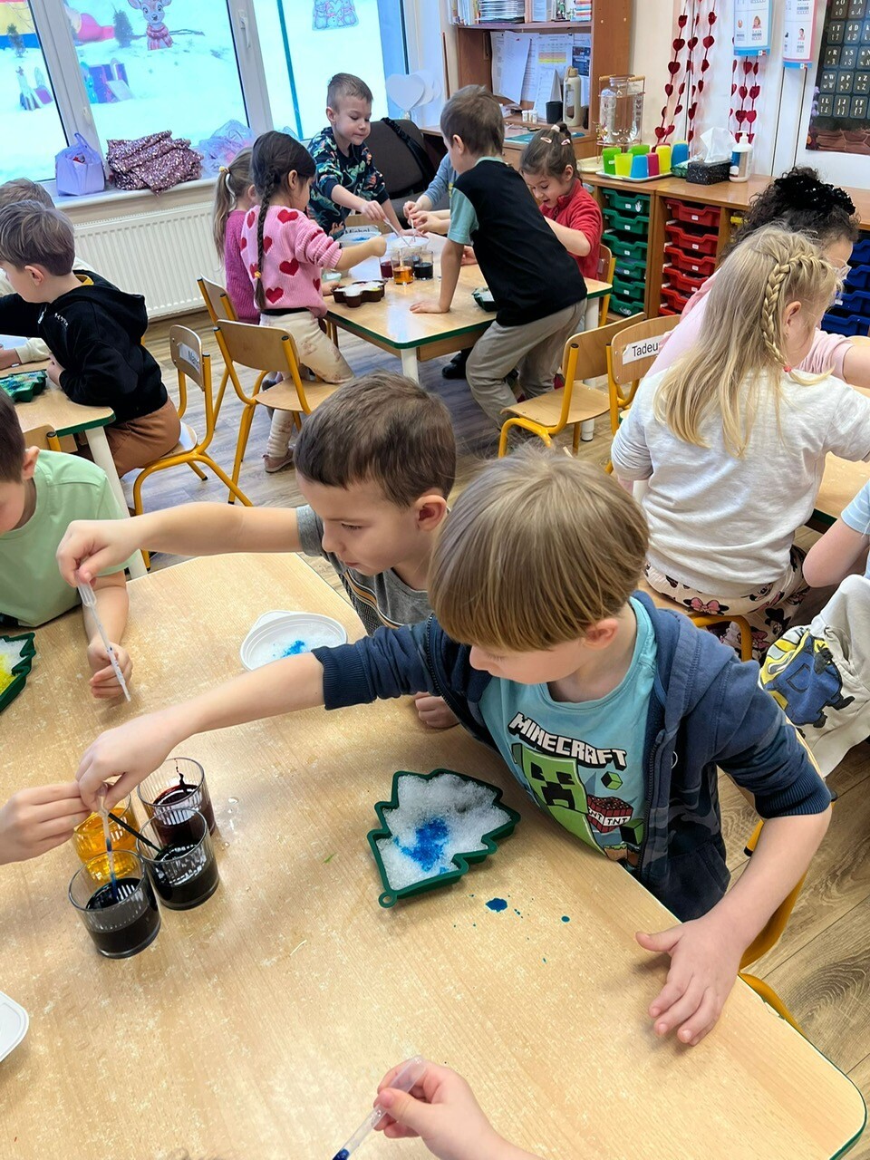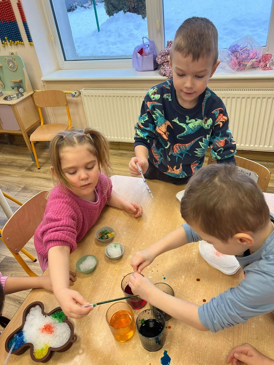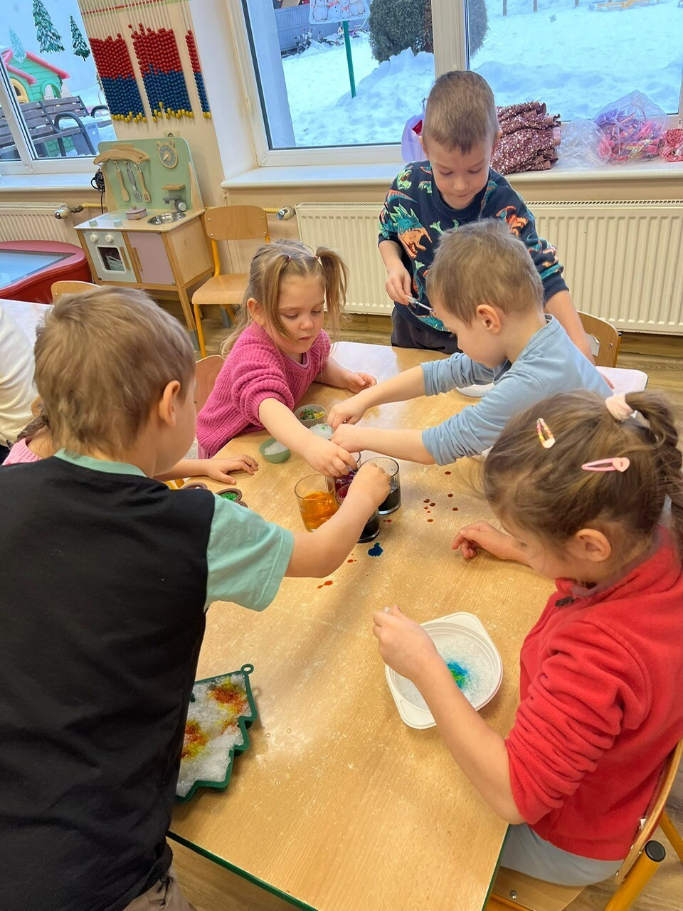 - Kolorowe eksperymenty – za pomocą pipet i barwników dzieci barwiły śnieg, ćwicząc precyzję ruchów i tworząc piękne, zimowe kompozycje,