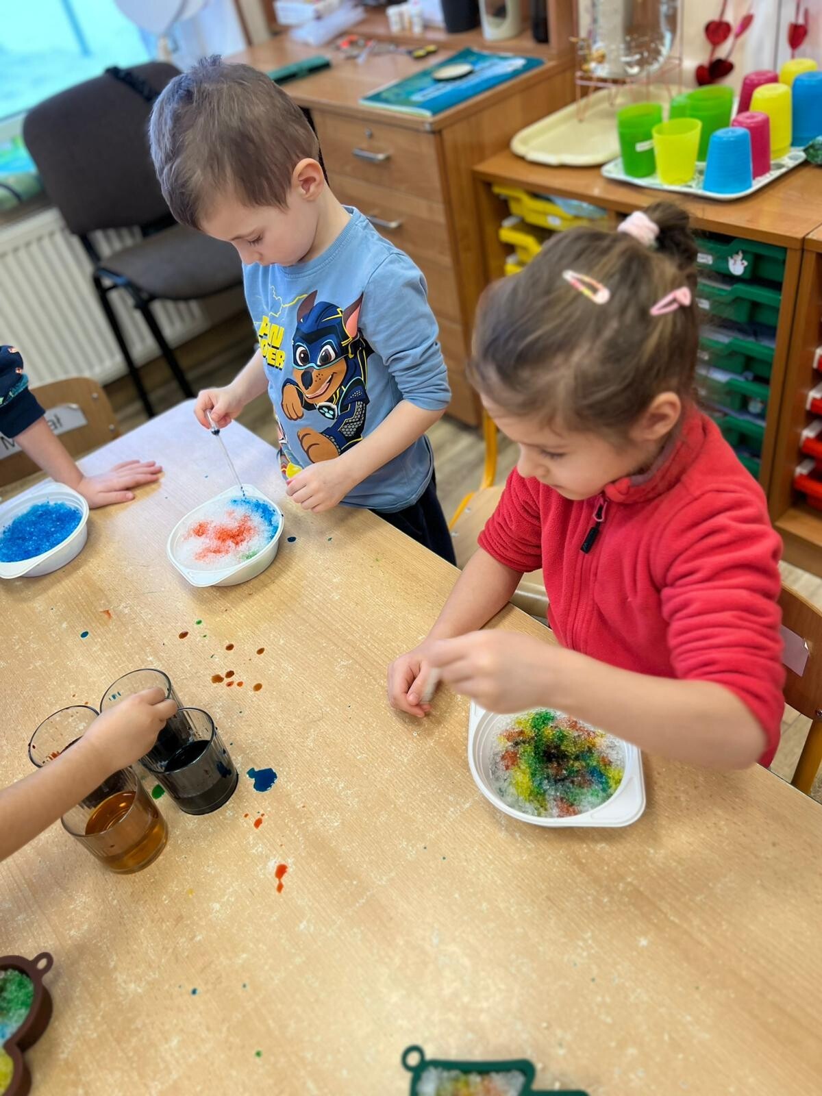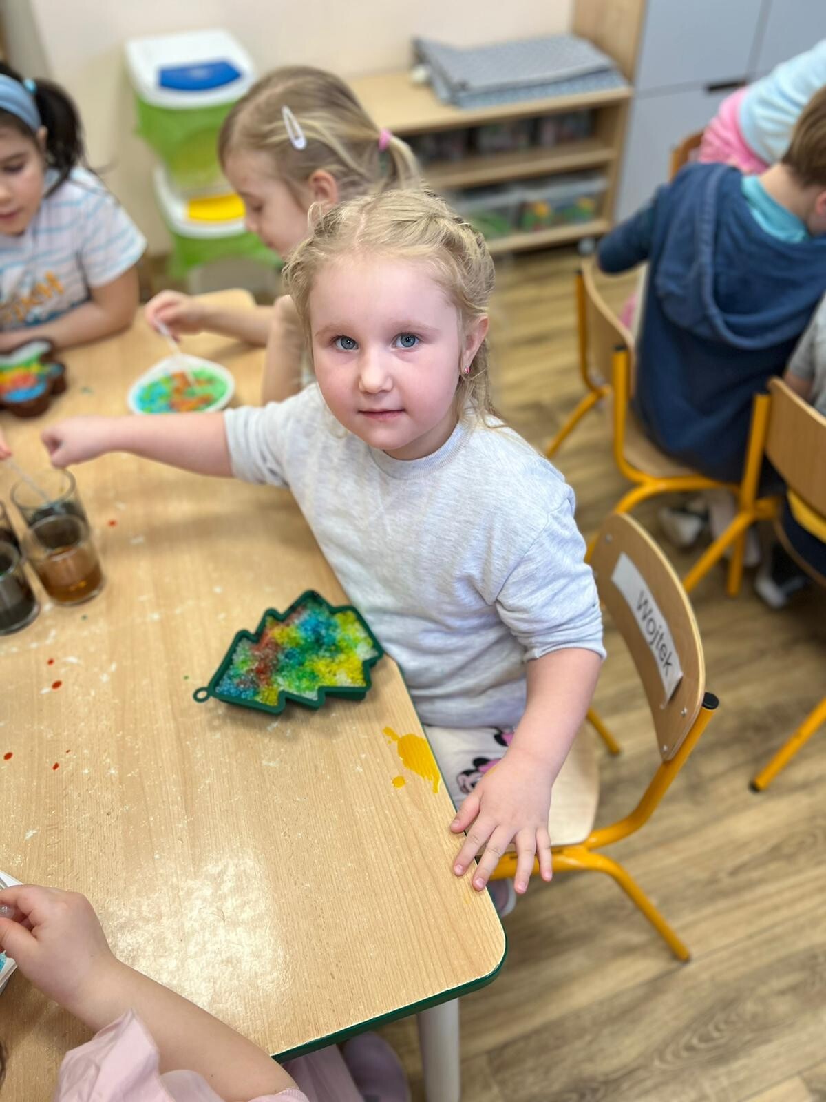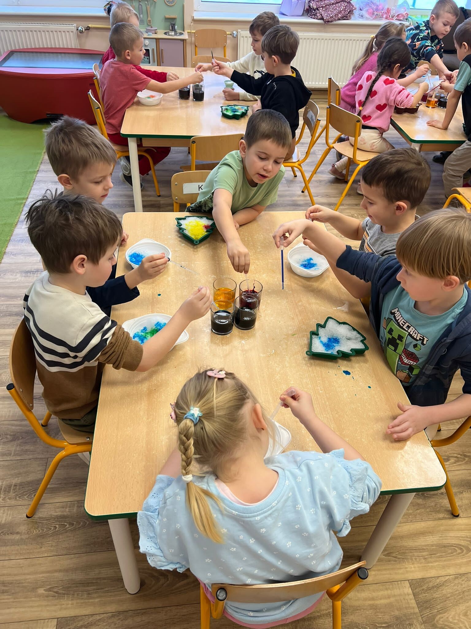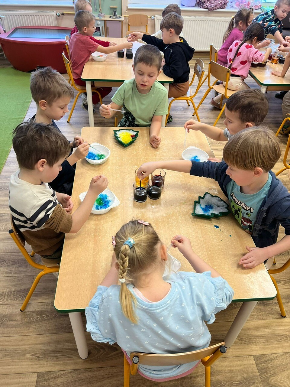 - Kolorowe eksperymenty – za pomocą pipet i barwników dzieci barwiły śnieg, ćwicząc precyzję ruchów i tworząc piękne, zimowe kompozycje,