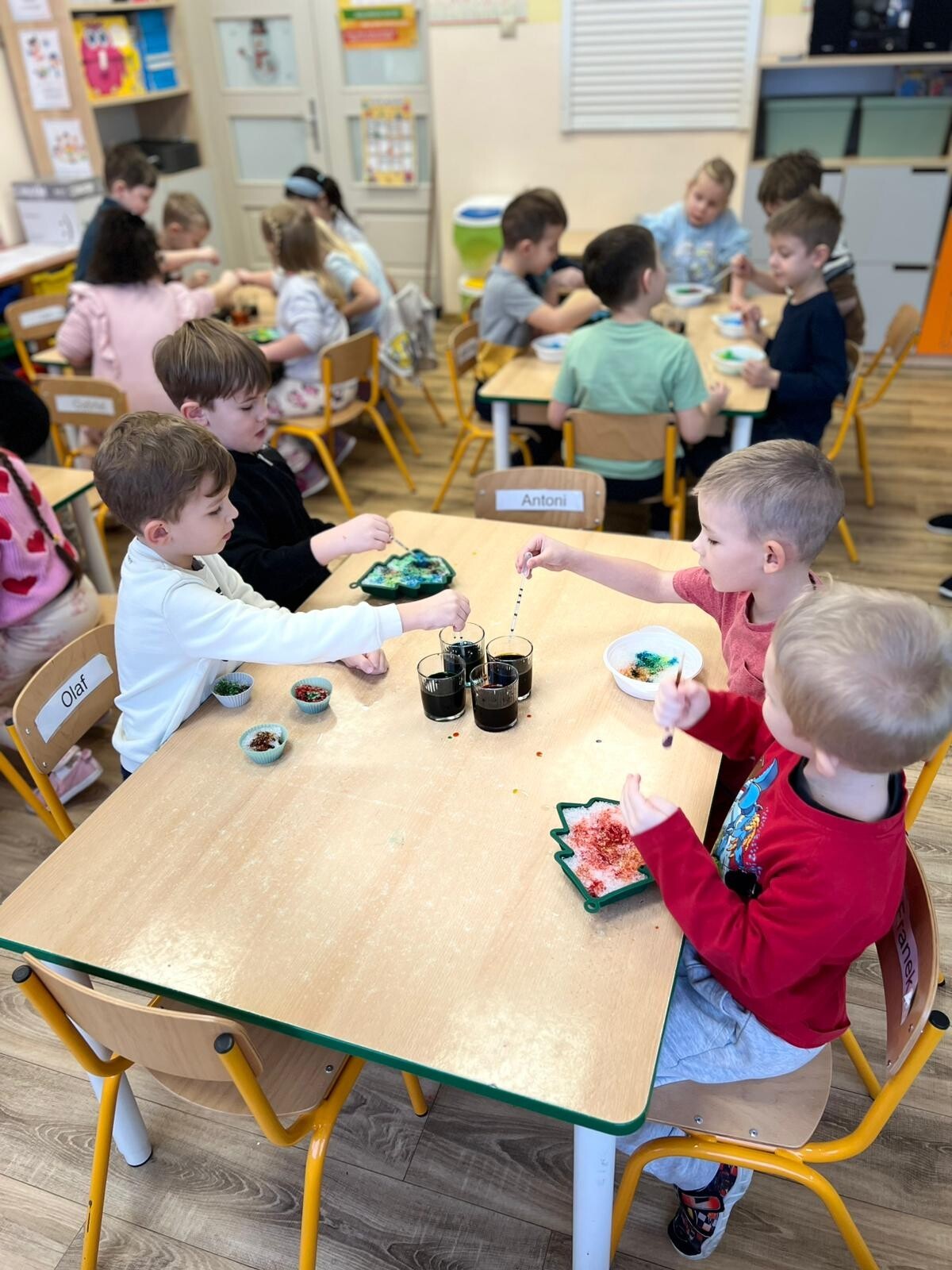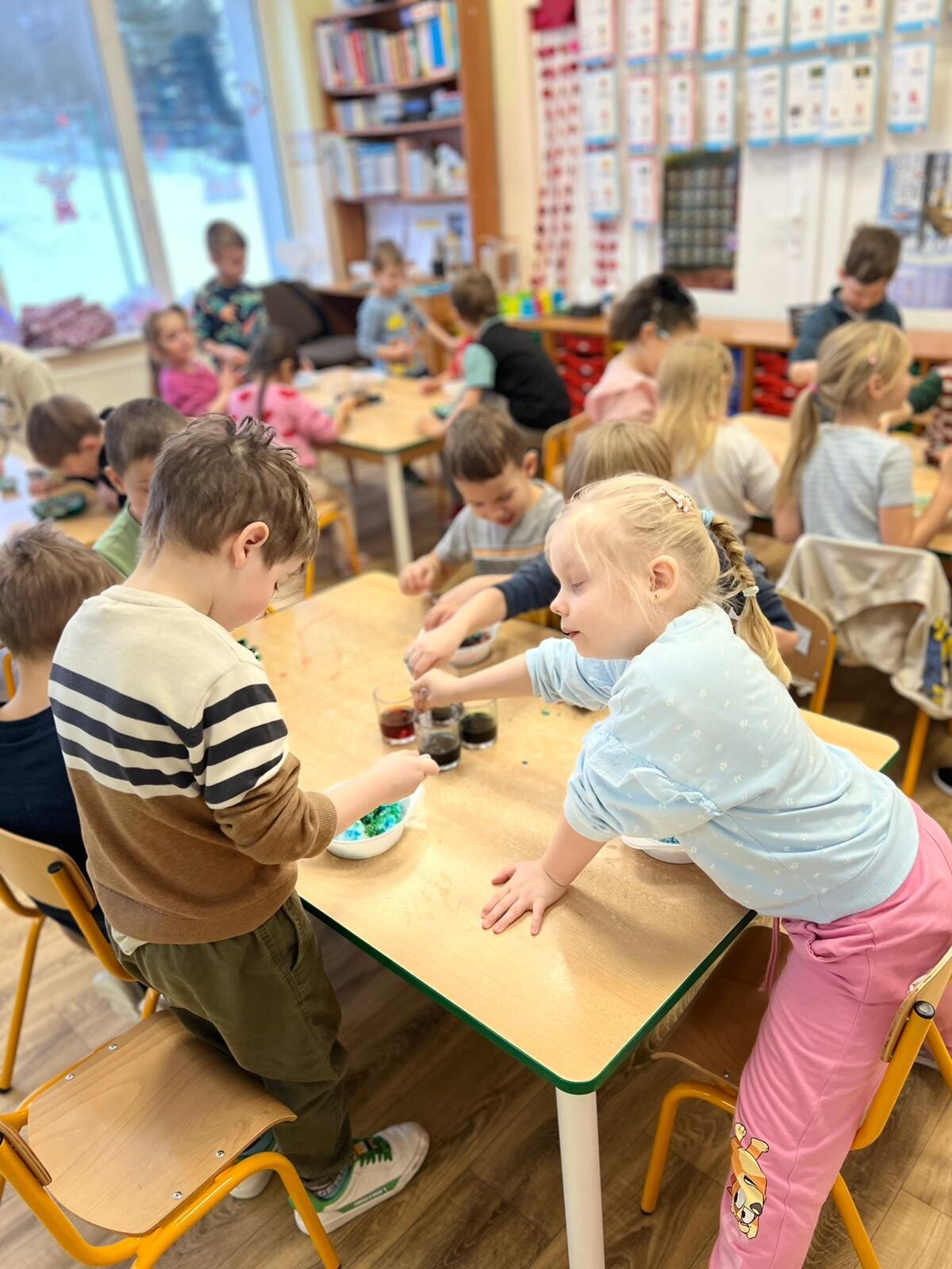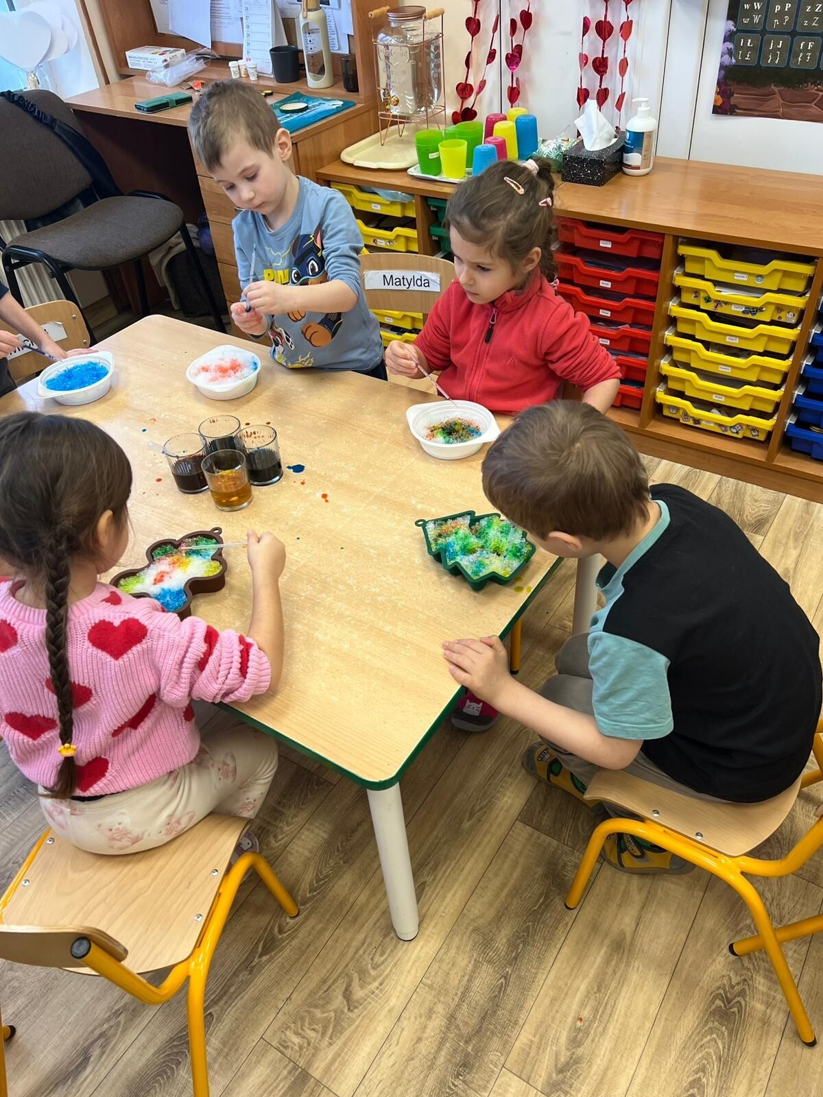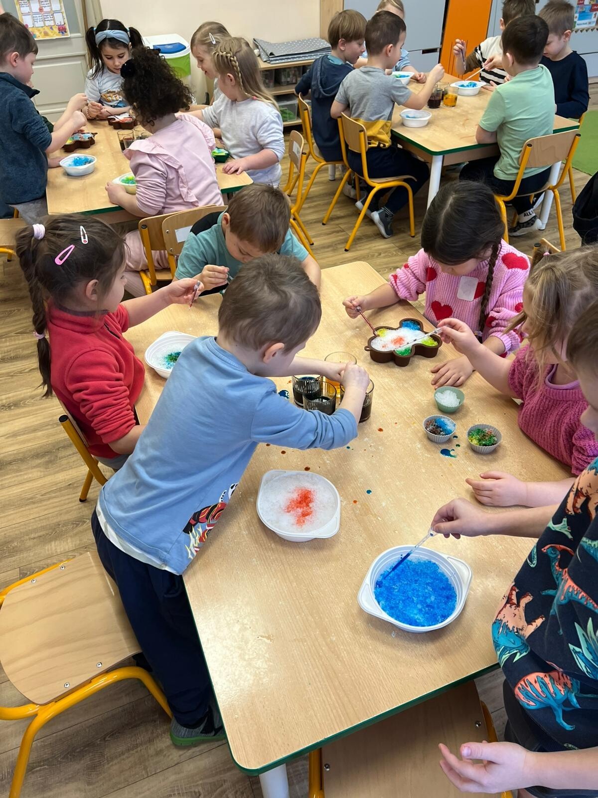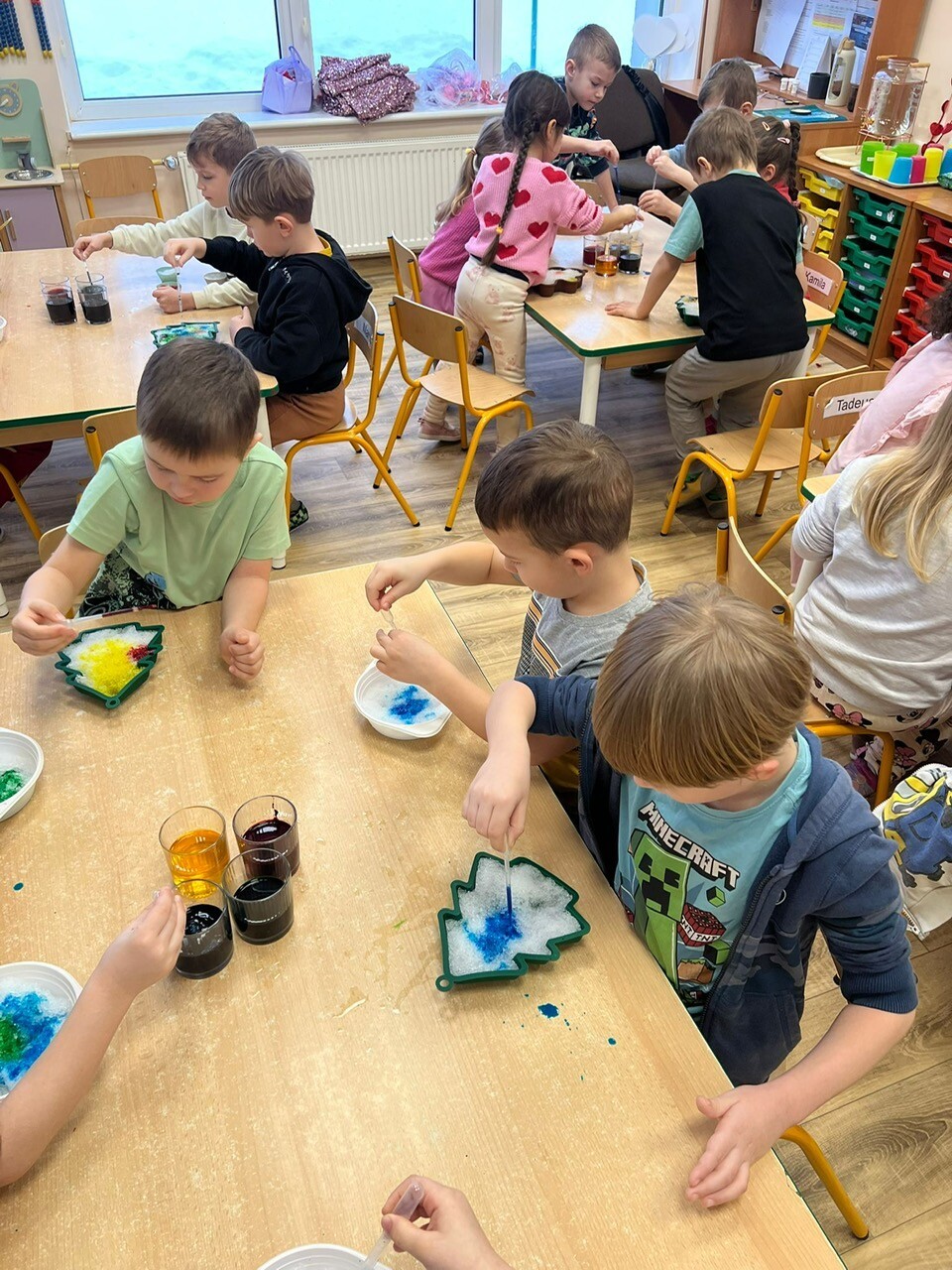- Kolorowe eksperymenty – za pomocą pipet i barwników dzieci barwiły śnieg, ćwicząc precyzję ruchów i tworząc piękne, zimowe kompozycje,