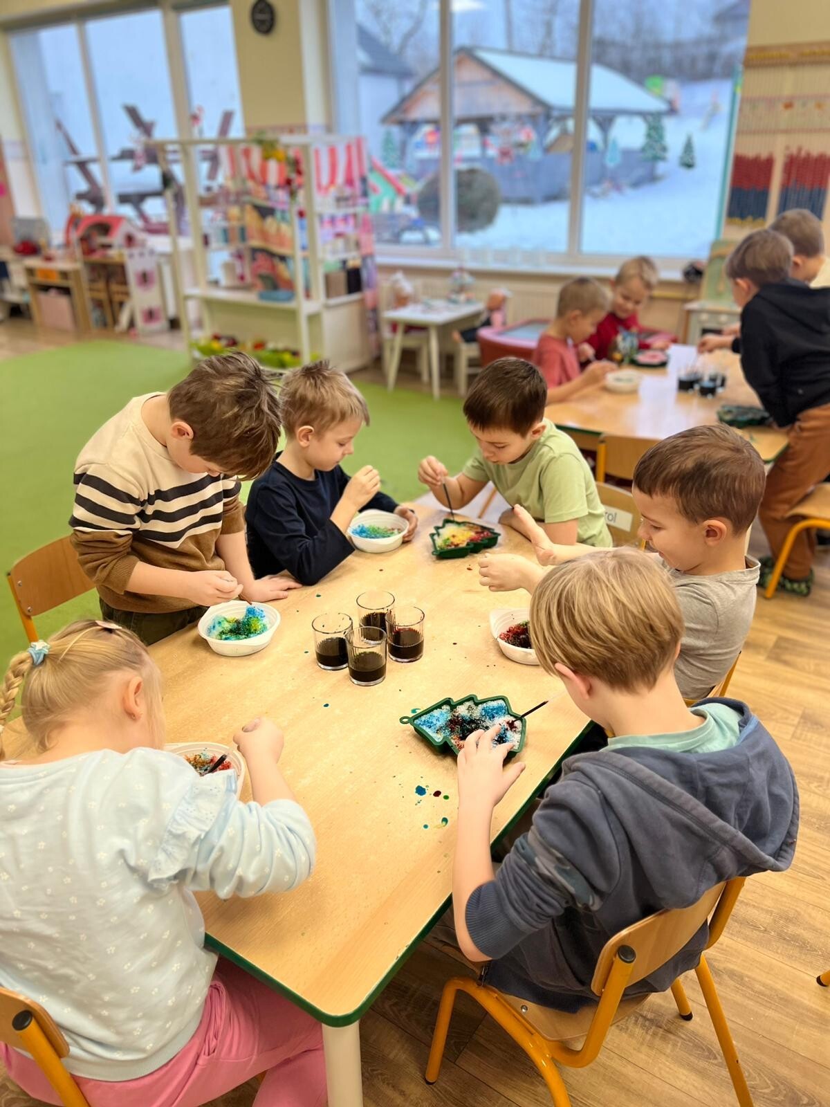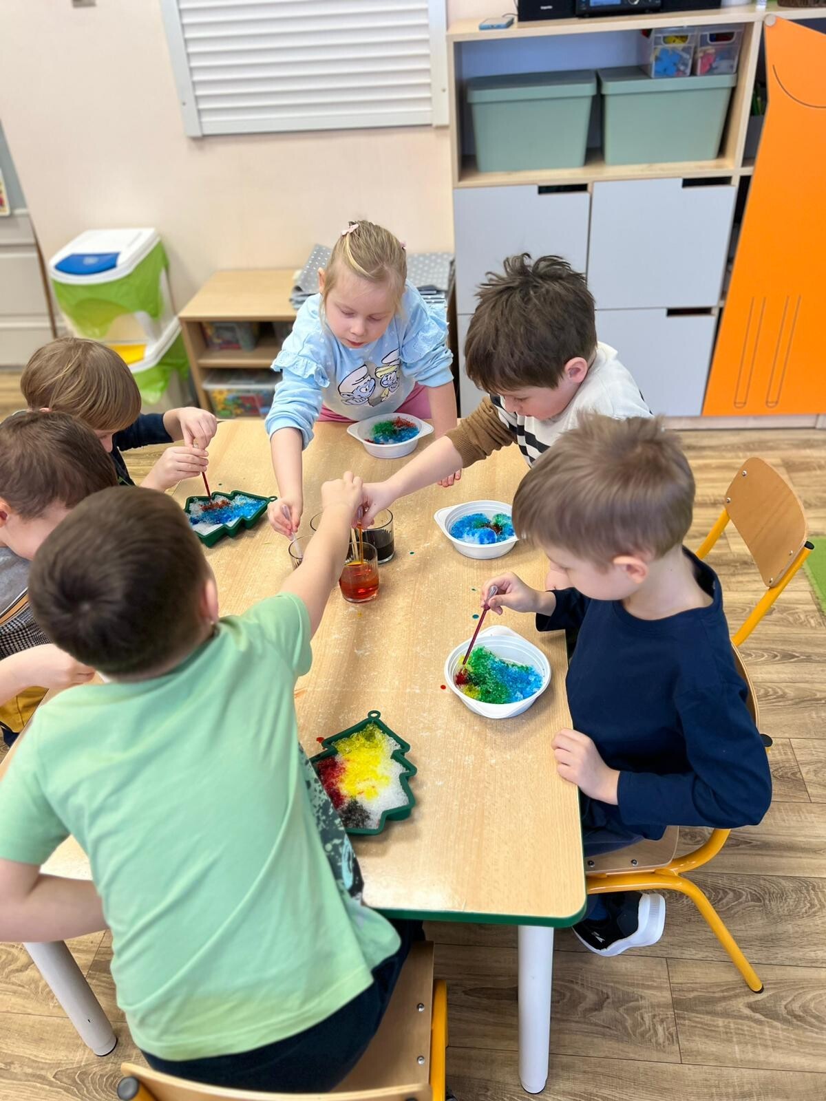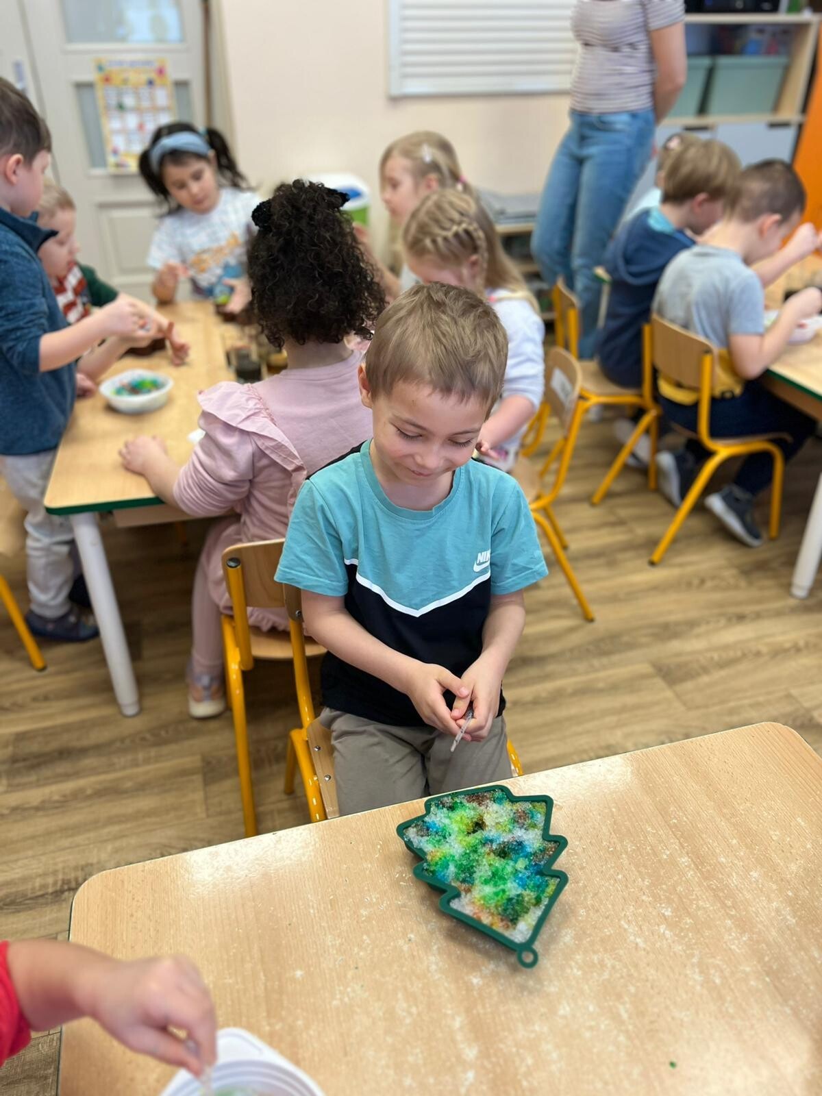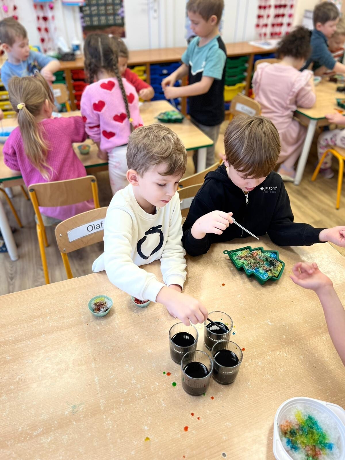 - Kolorowe eksperymenty – za pomocą pipet i barwników dzieci barwiły śnieg, ćwicząc precyzję ruchów i tworząc piękne, zimowe kompozycje,