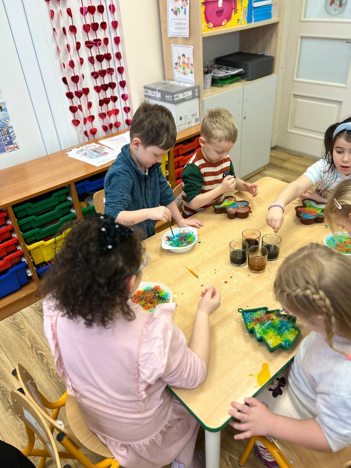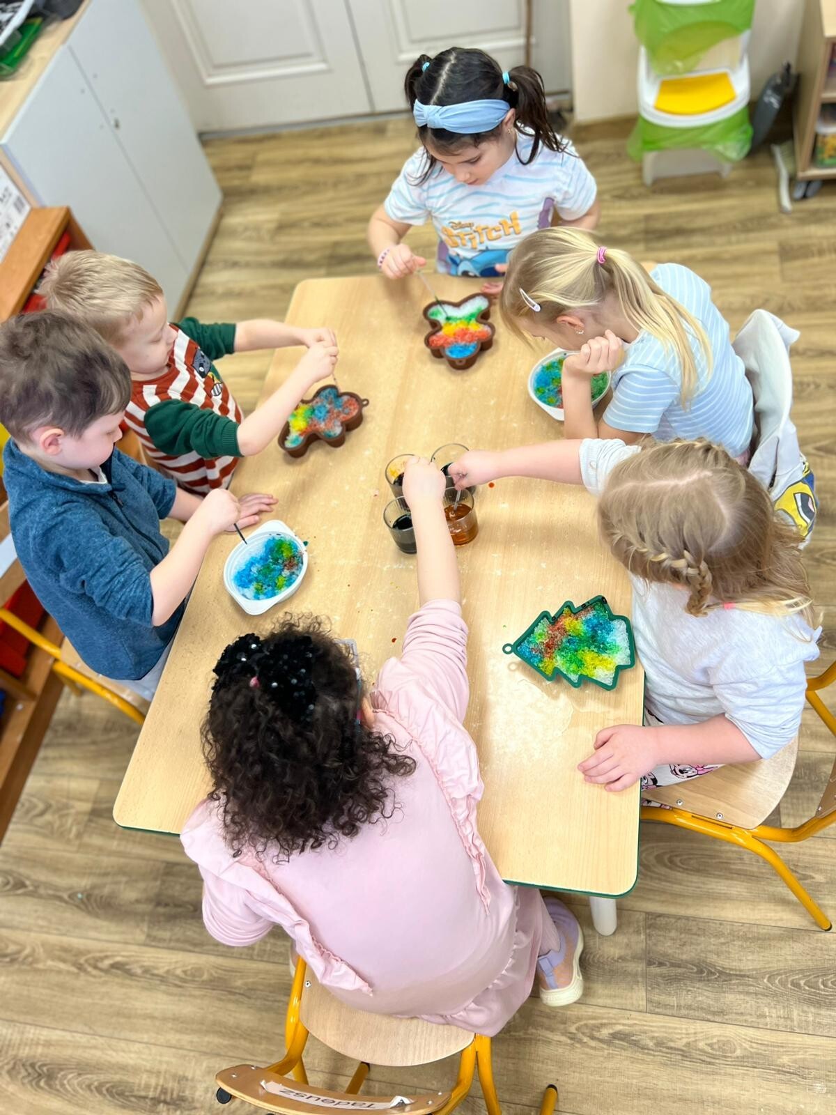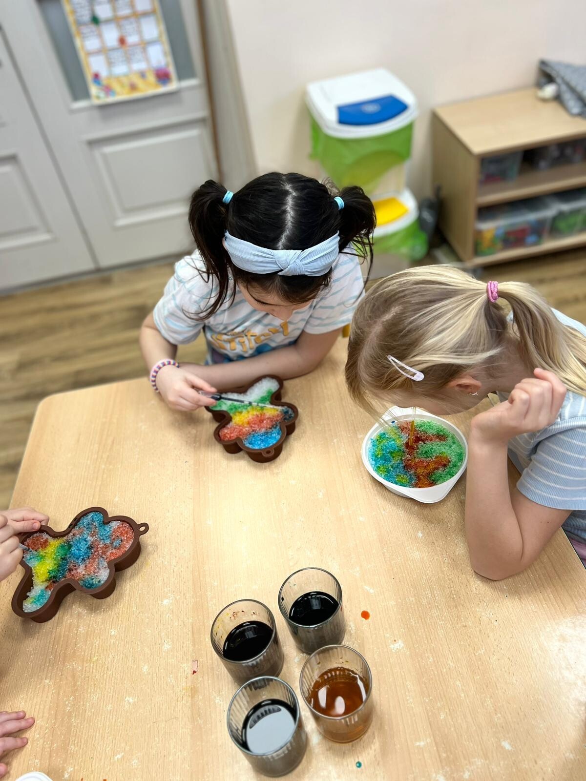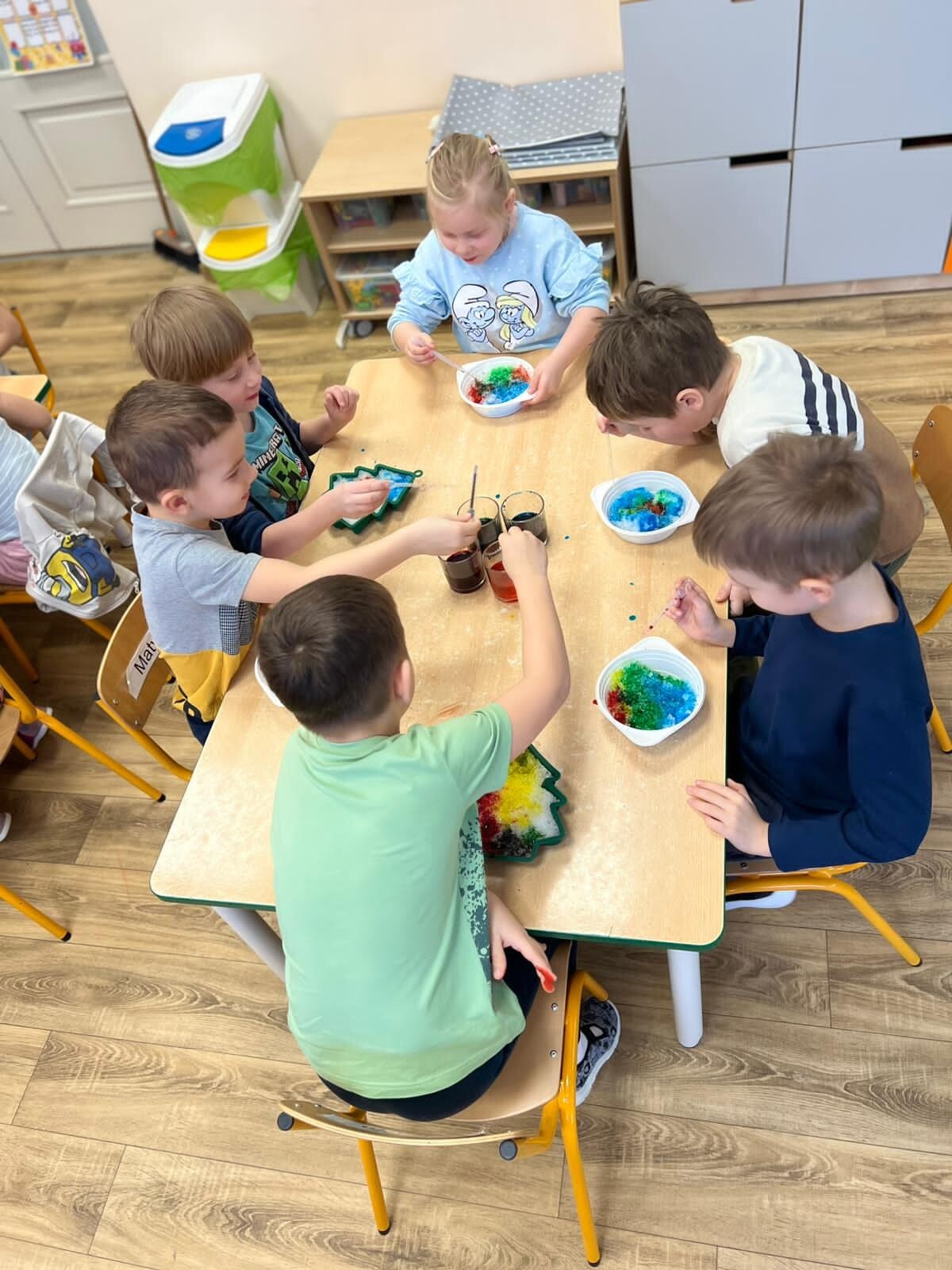 - Kolorowe eksperymenty – za pomocą pipet i barwników dzieci barwiły śnieg, ćwicząc precyzję ruchów i tworząc piękne, zimowe kompozycje,