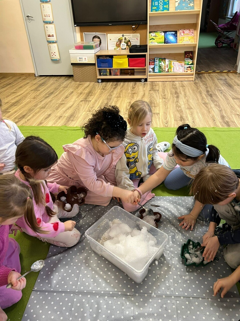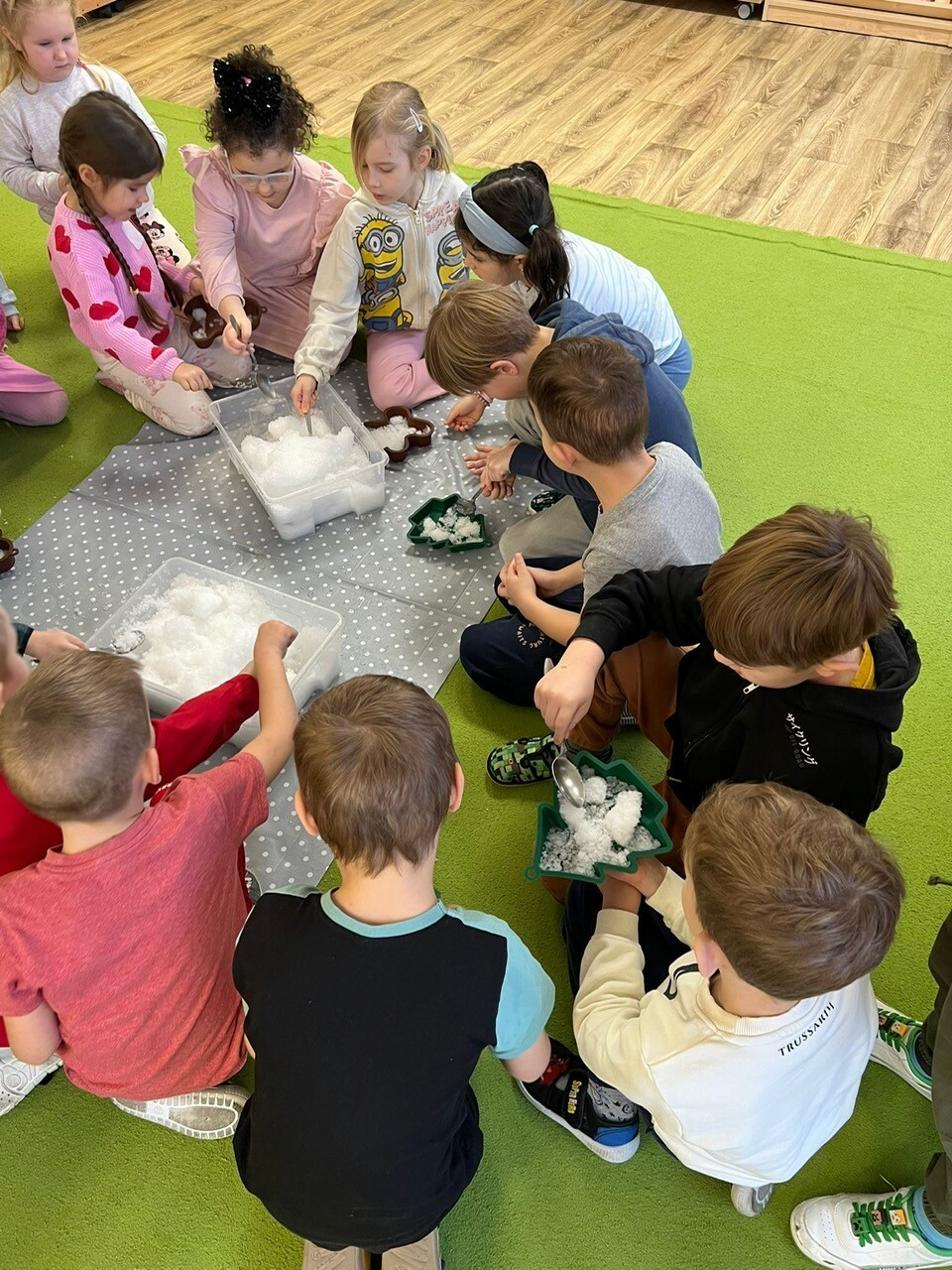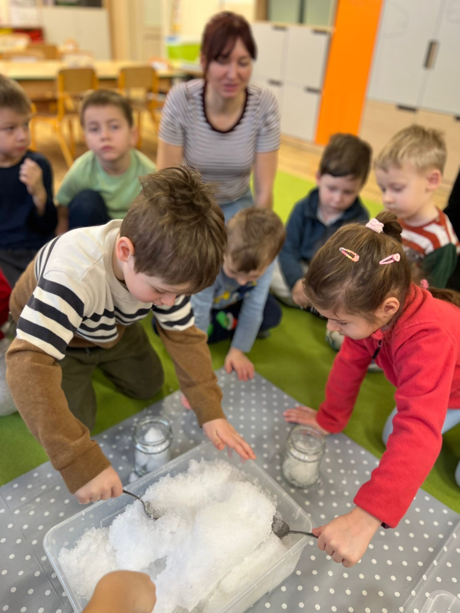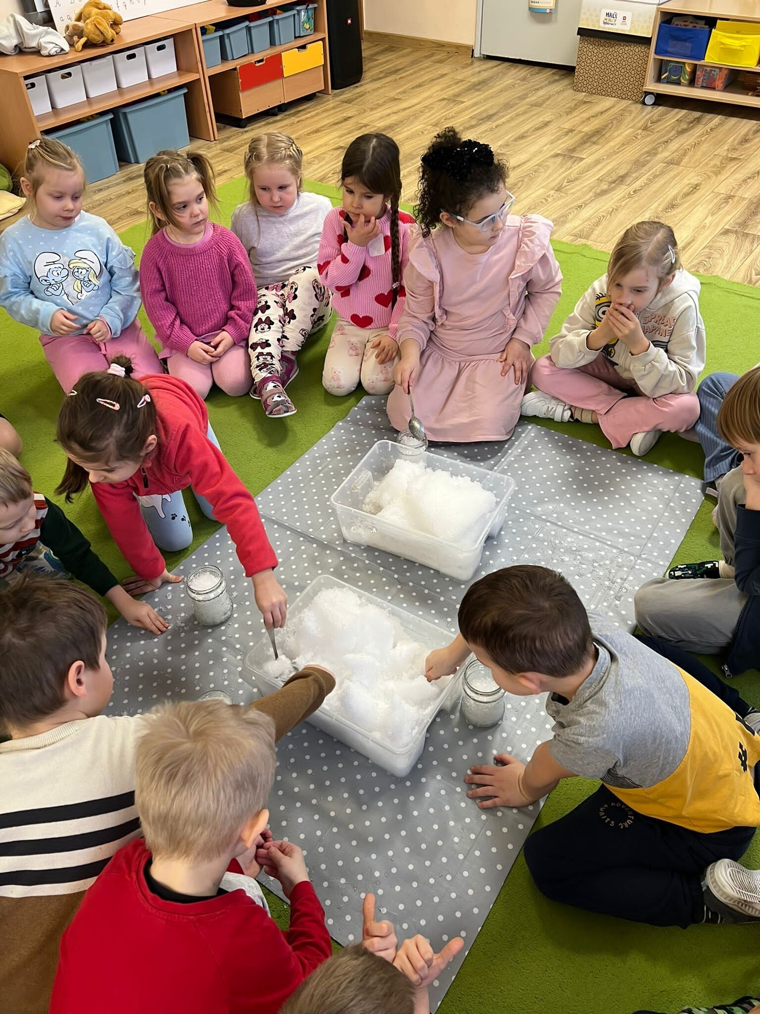 Dziś nasze przedszkole zamieniło się w małe laboratorium, a dzieci w prawdziwych badaczy świata. Z ogromnym zaangażowaniem i ciekawością odkrywaliśmy tajemnice śniegu.