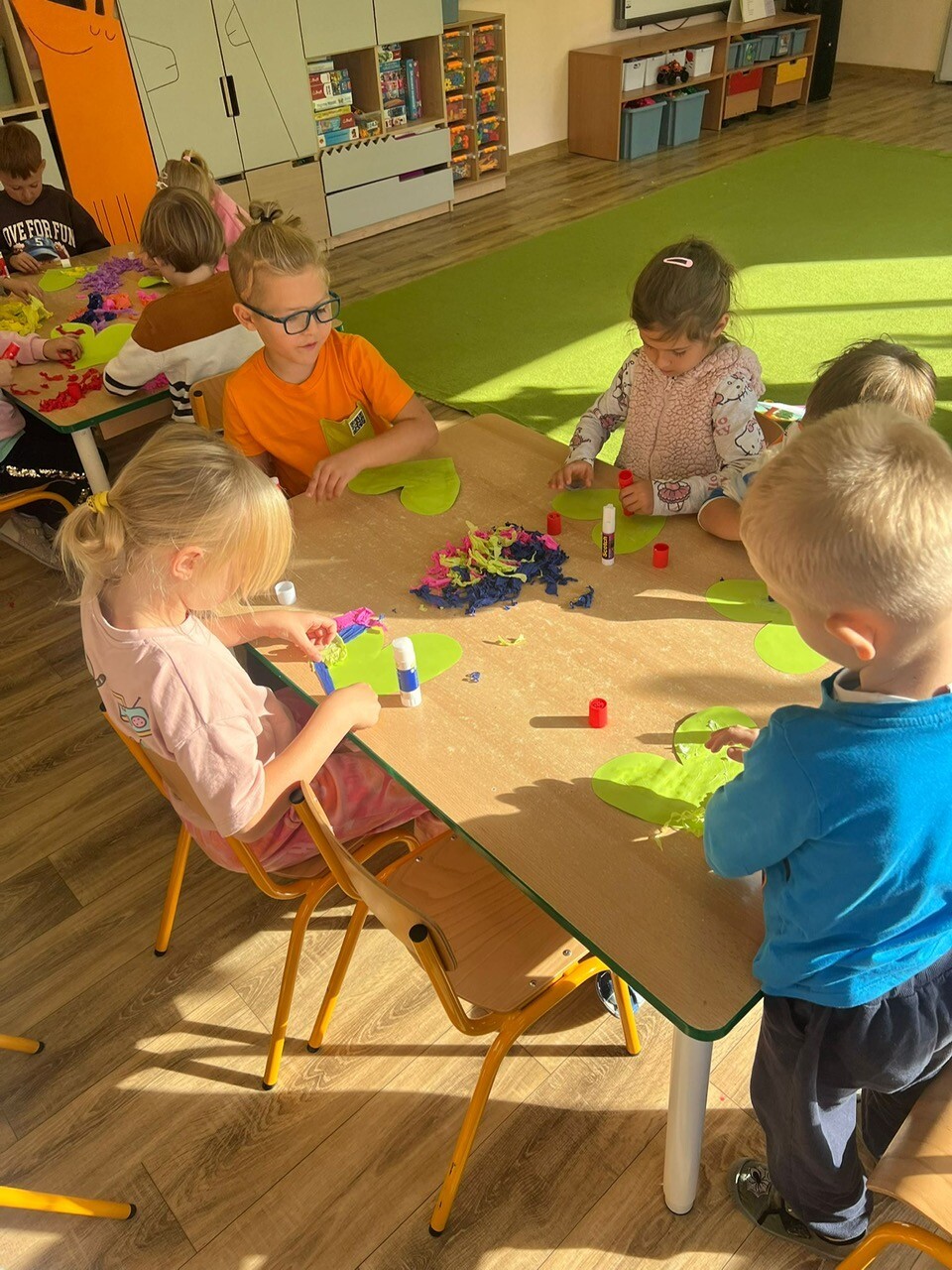 Dzieci z zaciekawieniem wysłuchały opowiadania „Serduszko z listków” o jeżyku Roro i emocjach, które towarzyszyły mu podczas dnia w przedszkolu.