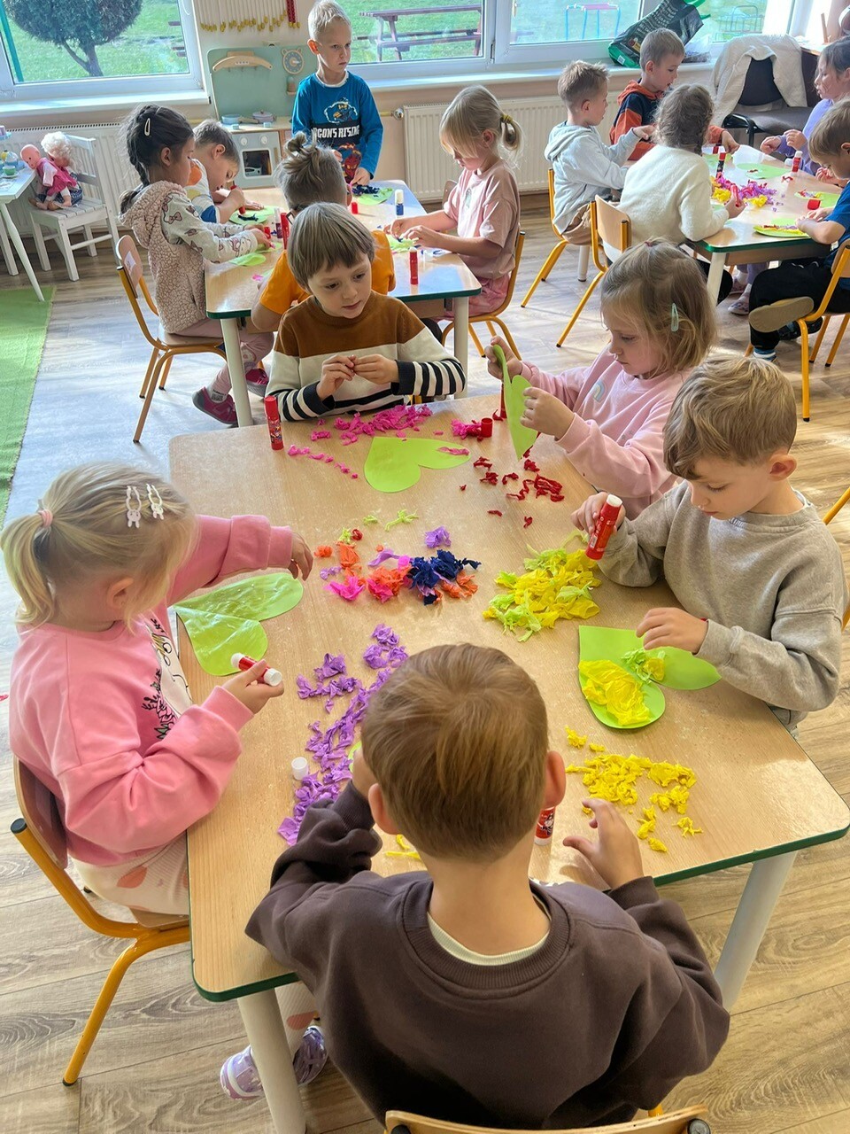 Przedszkolaki rwąc bibułę na kawałki opowiadały o sytuacjach, słowach które sprawiają im przykrość i je ranią, a następnie skleiły je tworząc piękne, kolorowe serca.